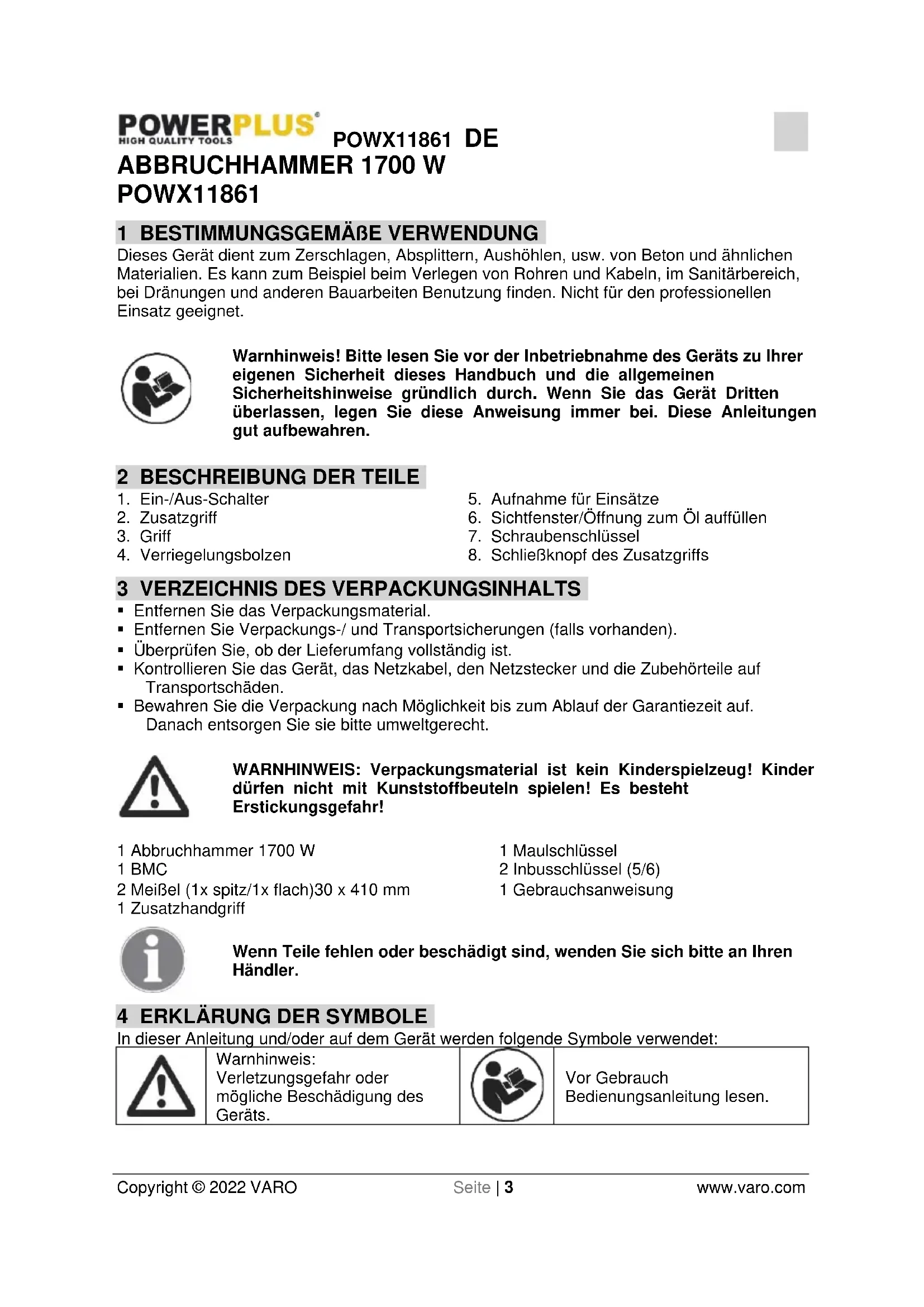 Copyright © 2022 VARO Seite | 3 www.varo.com ABBRUCHHAMMER 1700 W POWX11861 1 BESTIMMUNGSGEMÄßE VERWENDUNG Dieses Gerät dient zum Zerschlagen, Absplittern, Aushöhlen, usw. von Beton und ähnlichen Materialien. Es kann zum Beispiel beim Verlegen von Rohren und Kabeln, im Sanitärbereich, bei Dränungen und anderen Bauarbeiten Benutzung finden. Nicht für den professionellen Einsatz geeignet. Warnhinweis! Bitte lesen Sie vor der Inbetriebnahme des Geräts zu Ihrer eigenen Sicherheit dieses Handbuch und die allgemeinen Sicherheitshinweise gründlich durch. Wenn Sie das Gerät Dritten überlassen, legen Sie diese Anweisung immer bei. Diese Anleitungen gut aufbewahren.