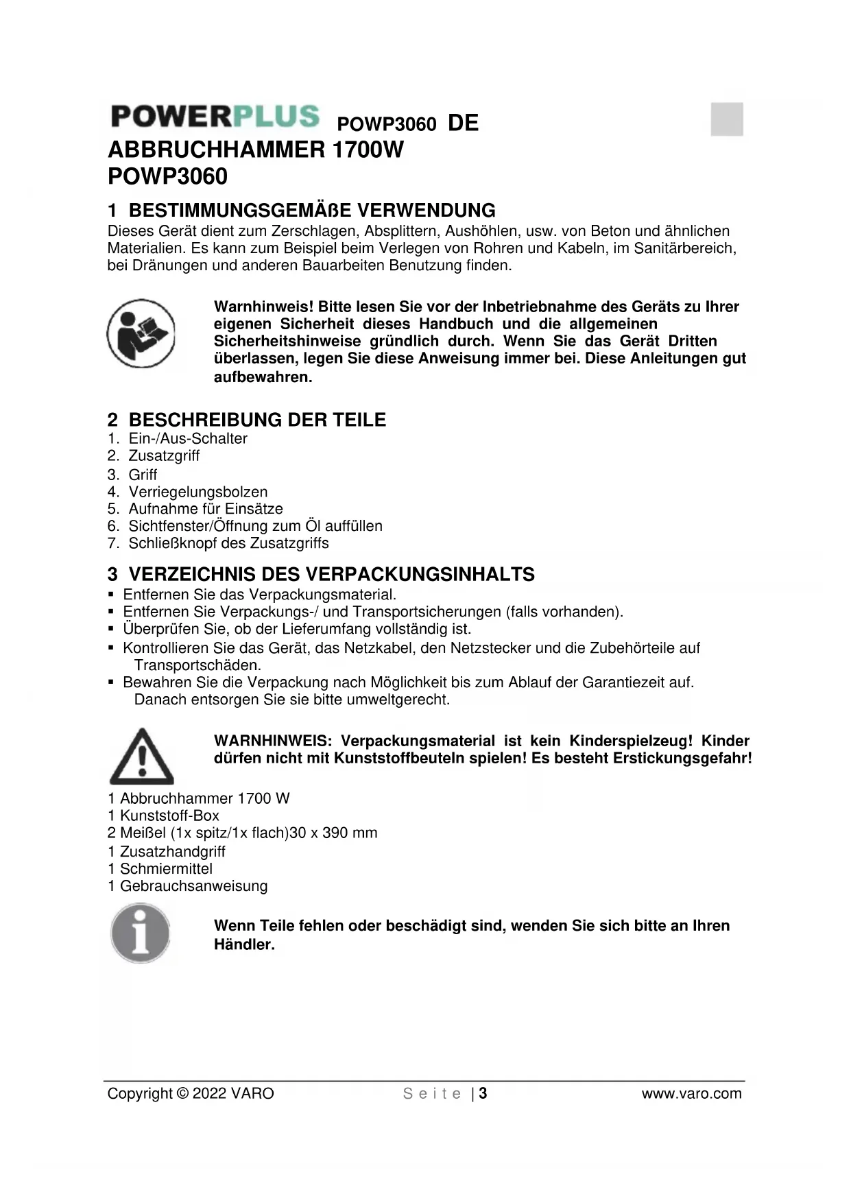 - Bewahren Sie die Verpackung nach Möglichkeit bis zum Ablauf der Garantiezeit auf. Danach entsorgen Sie sie bitte umweltgerecht. WARNHINWEIS: Verpackungsmaterial ist kein Kinderspielzeug! Kinder dürfen nicht mit Kunststoffbeuteln spielen! Es besteht Erstickungsgefahr! 1 Abbruchhammer 1700 W 1 Kunststoff-Box 2 Meißel (1x spitz/1x flach)30 x 390 mm 1 Zusatzhandgriff 1 Schmiermittel 1 Gebrauchsanweisung Wenn Teile fehlen oder beschädigt sind, wenden Sie sich bitte an Ihren Händler.POWP3060 DE Copyright © 2022 VARO S e i t e | 4 www.varo.com