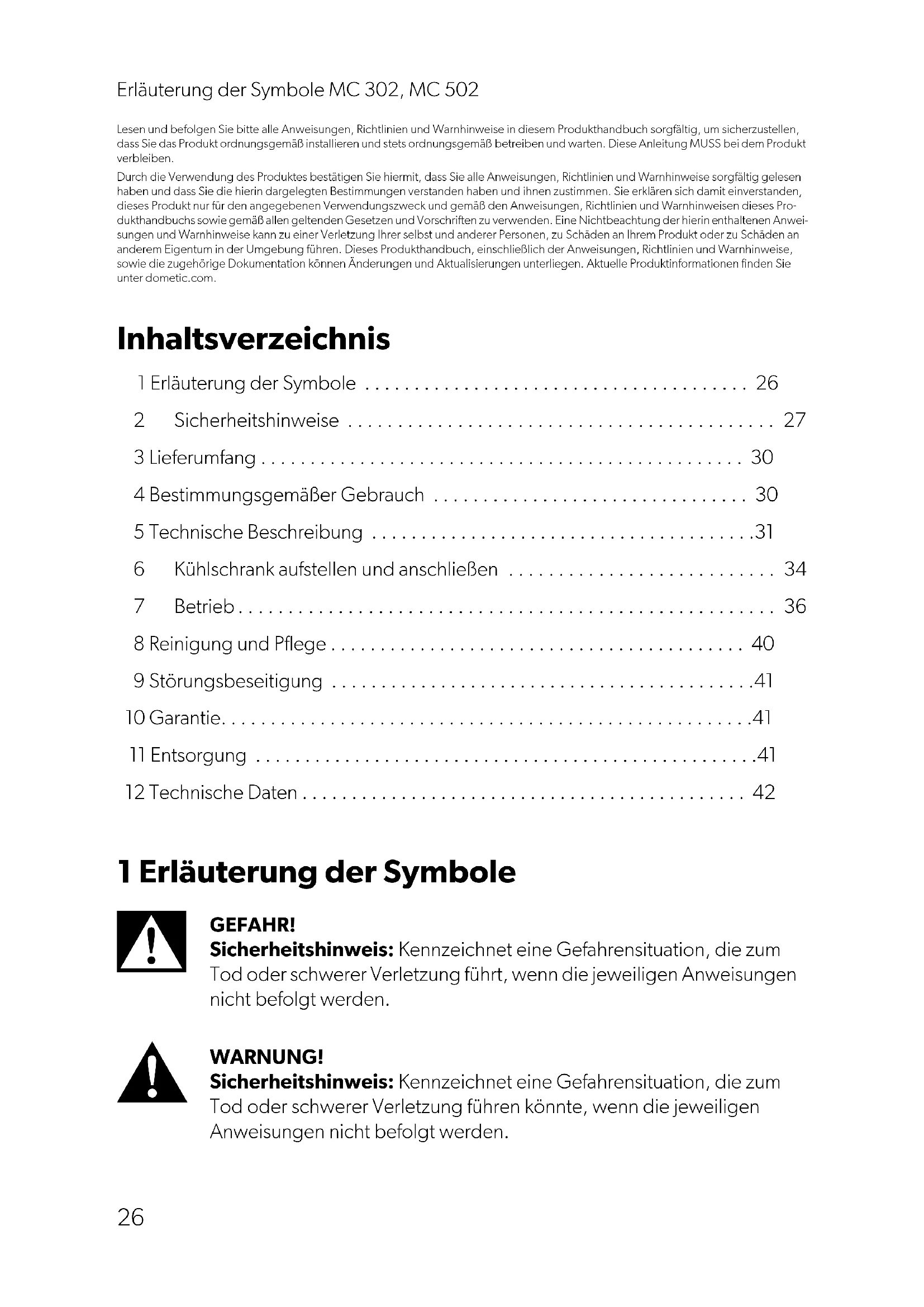 - Lesen und befolgen Sie bitte alle Anweisungen, Richtlinien und Warnhinweise in diesem Produkthandbuch sorgfältig, um sicherzustellen, dass Sie das Produkt ordnungsgemäß installieren und stets ordnungsgemäß betreiben und warten. Diese Anleitung MUSS bei dem Produkt verbleiben. Durch die Verwendung des Produktes bestätigen Sie hiermit, dass Sie alle Anweisungen, Richtlinien und Warnhinweise sorgfältig gelesen haben und dass Sie die hierin dargelegten Bestimmungen verstanden haben und ihnen zustimmen. Sie erklären sich damit einverstanden, dieses Produkt nur für den angegebenen Verwendungszweck und gemäß den Anweisungen, Richtlinien und Warnhinweisen dieses Pro- dukthandbuchs sowie gemäß allen geltenden Gesetzen und Vorschriften zu verwenden. Eine Nichtbeachtung der hierin enthaltenen Anwei- sungen und Warnhinweise kann zu einer Verletzung Ihrer selbst und anderer Personen, zu Schäden an Ihrem Produkt oder zu Schäden an anderem Eigentum in der Umgebung führen. Dieses Produkthandbuch, einschließlich der Anweisungen, Richtlinien und Warnhinweise, sowie die zugehörige Dokumentation können Änderungen und Aktualisierungen unterliegen. Aktuelle Produktinformationen finden Sie unter dometic.com. Inhaltsverzeichnis 1 Erläuterung der Symbole p. 26