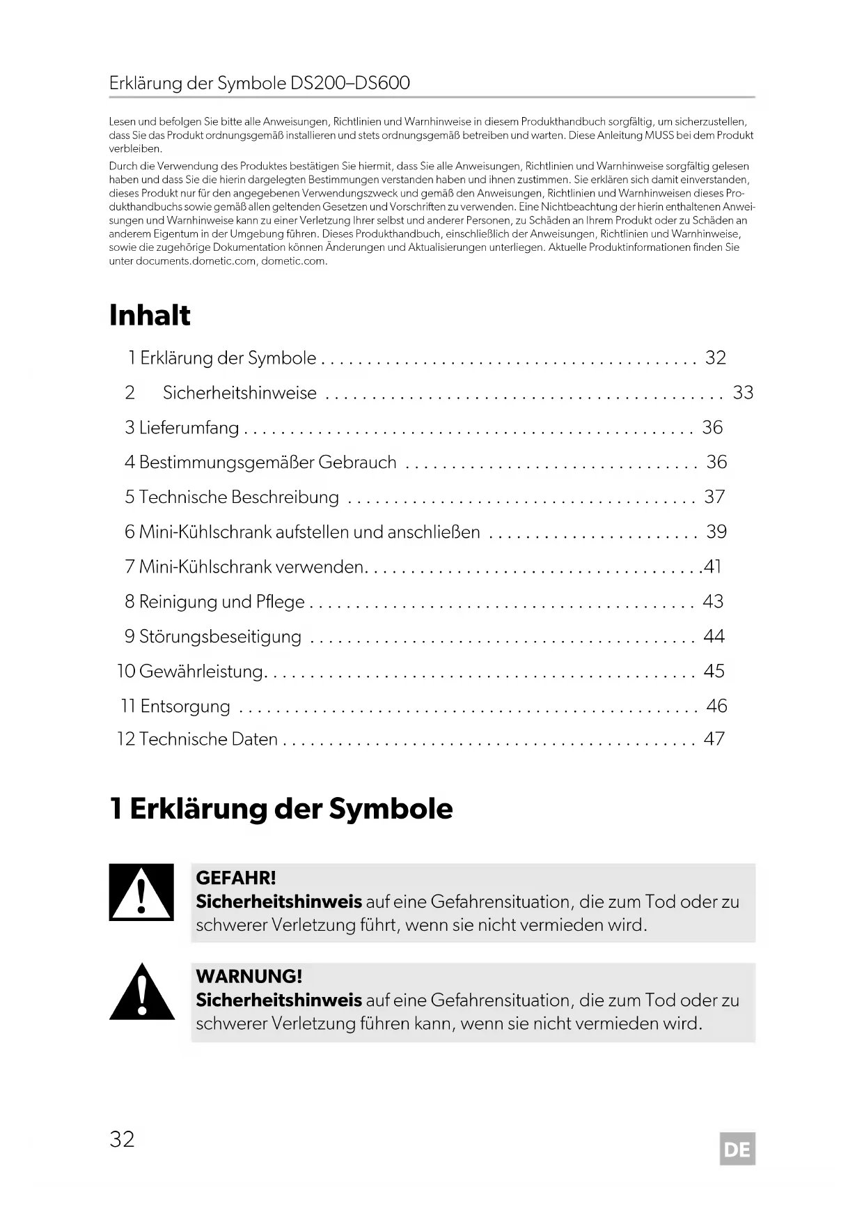 GEFAHR! Sicherheitshinweis auf eine Gefahrensituation, die zum Tod oder zu schwerer Verletzung führt, wenn sie nicht vermieden wird. WARNUNG! Sicherheitshinweis auf eine Gefahrensituation, die zum Tod oder zu schwerer Verletzung führen kann, wenn sie nicht vermieden wird. DometicDS200-300-400-600_IOM_4445103315_EMEA16_2020-xx-xx.book Seite 32 Mittwoch, 3. März 2021 11:36 11DE DS200–DS600 Sicherheitshinweise