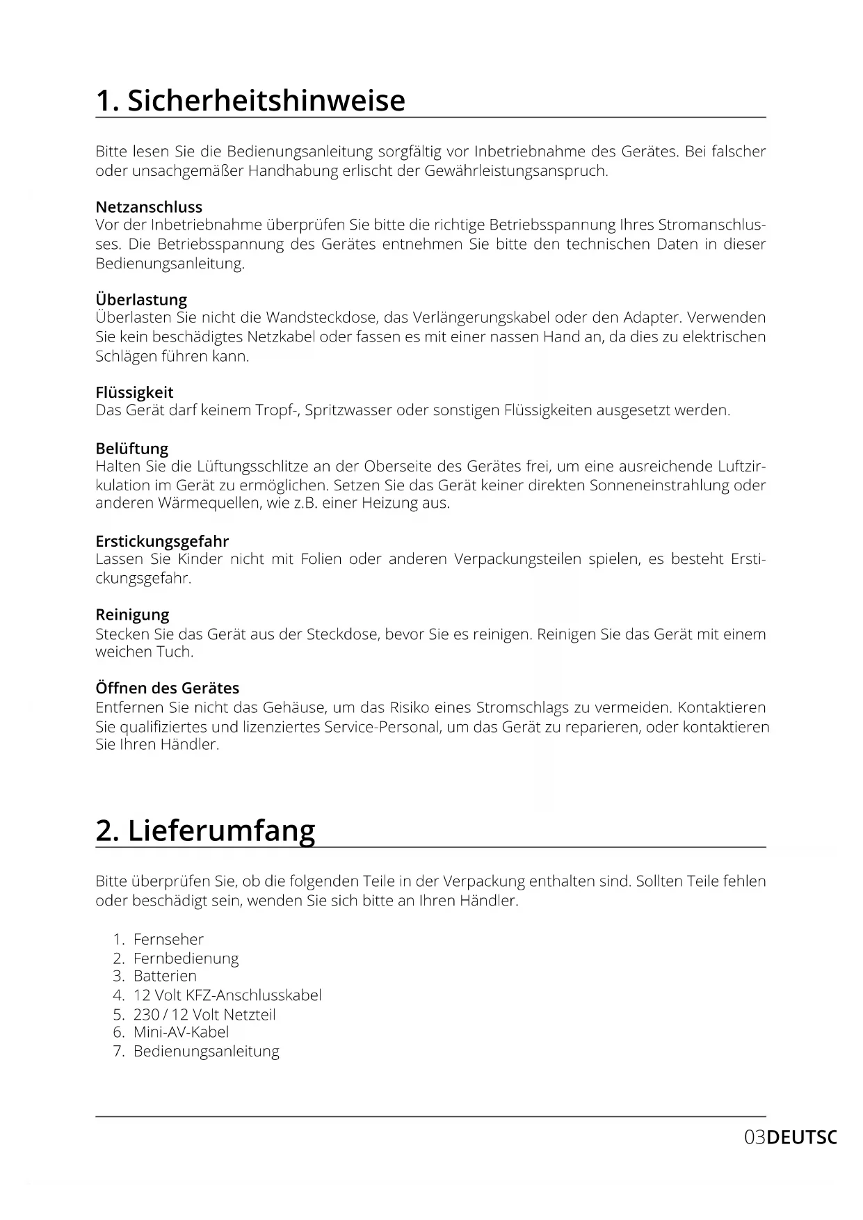 Bitte lesen Sie die Bedienungsanleitung sorgfältig vor Inbetriebnahme des Gerätes. Bei falscher oder unsachgemäßer Handhabung erlischt der Gewährleistungsanspruch. Netzanschluss Vor der Inbetriebnahme überprüfen Sie bitte die richtige Betriebsspannung Ihres Stromanschlus- ses. Die Betriebsspannung des Gerätes entnehmen Sie bitte den technischen Daten in dieser Bedienungsanleitung. Überlastung Überlasten Sie nicht die Wandsteckdose, das Verlängerungskabel oder den Adapter. Verwenden Sie kein beschädigtes Netzkabel oder fassen es mit einer nassen Hand an, da dies zu elektrischen Schlägen führen kann. Flüssigkeit Das Gerät darf keinem Tropf-, Spritzwasser oder sonstigen Flüssigkeiten ausgesetzt werden. Belüftung Halten Sie die Lüftungsschlitze an der Oberseite des Gerätes frei, um eine ausreichende Luftzir- kulation im Gerät zu ermöglichen. Setzen Sie das Gerät keiner direkten Sonneneinstrahlung oder anderen Wärmequellen, wie z.B. einer Heizung aus. Erstickungsgefahr Lassen Sie Kinder nicht mit Folien oder anderen Verpackungsteilen spielen, es besteht Ersti- ckungsgefahr. Reinigung Stecken Sie das Gerät aus der Steckdose, bevor Sie es reinigen. Reinigen Sie das Gerät mit einem weichen Tuch. Önen des Gerätes Entfernen Sie nicht das Gehäuse, um das Risiko eines Stromschlags zu vermeiden. Kontaktieren Sie qualiziertes und lizenziertes Service-Personal, um das Gerät zu reparieren, oder kontaktieren Sie Ihren Händler.Stecken Sie den Standfuß wie abgebildet an den Fernseher. Benutzen Sie einen geeigneten Schrau- bendreher und befestigen Sie die Standfüße mit den beiliegenden Schrauben. Achten Sie darauf, dass die Schrauben richtig angezo- gen sind. Legen Sie den Fernseher auf eine ache, weiche Unterlage (z. B. Decke, Schaumsto, ...) um Schä- den am Fernseher, bzw. Display zu vermeiden.