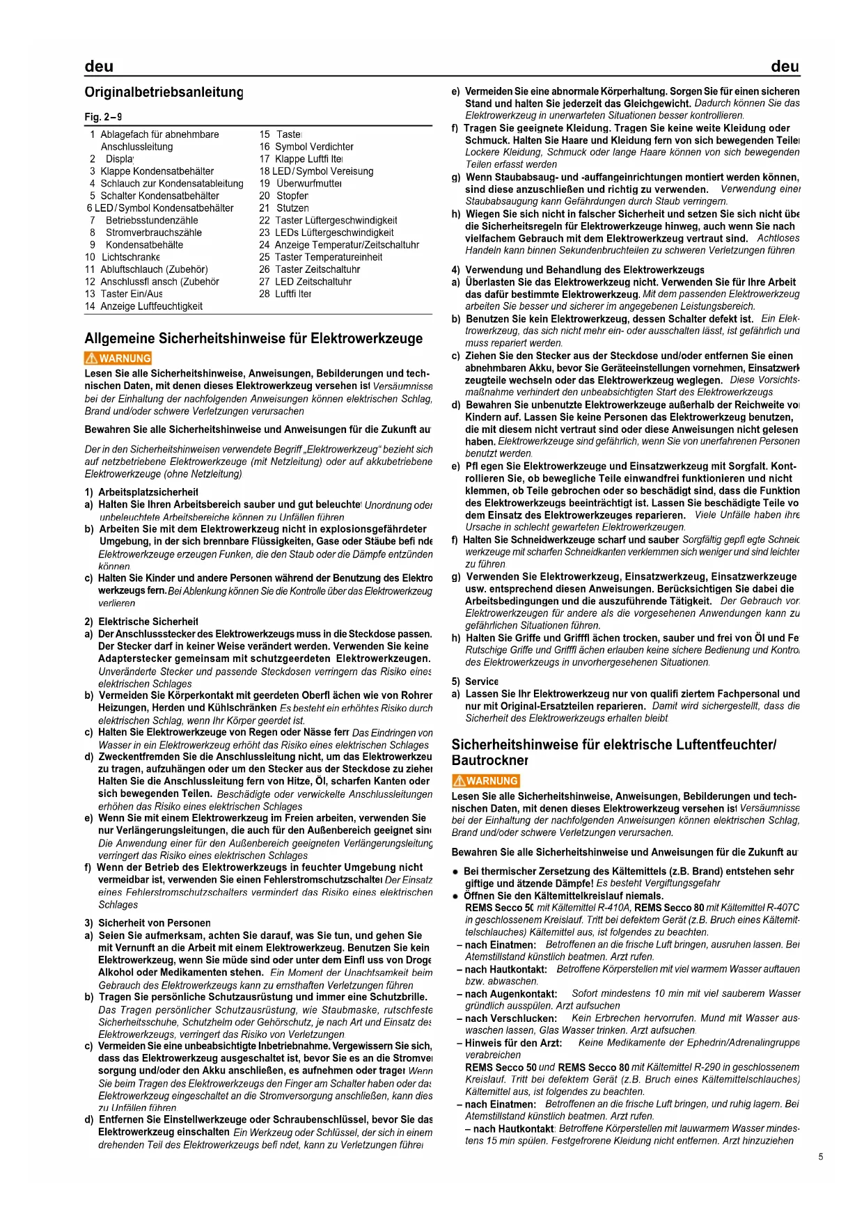 Öffnen Sie den Kältemittelkreislauf niemals. REMS Secco 50 mit Kältemittel R-410A, REMS Secco 80 mit Kältemittel R-407C in geschlossenem Kreislauf. Tritt bei defektem Gerät (z.B. Bruch eines Kältemit- telschlauches) Kältemittel aus, ist folgendes zu beachten: – nach Einatmen: Betroffenen an die frische Luft bringen, ausruhen lassen. Bei Atemstillstand künstlich beatmen. Arzt rufen. – nach Hautkontakt: Betroffene Körperstellen mit viel warmem Wasser auftauen bzw. abwaschen. – nach Augenkontakt: Sofort mindestens 10 min mit viel sauberem Wasser gründlich ausspülen. Arzt aufsuchen. – nach Verschlucken: Kein Erbrechen hervorrufen. Mund mit Wasser aus- waschen lassen, Glas Wasser trinken. Arzt aufsuchen. – Hinweis für den Arzt: Keine Medikamente der Ephedrin/Adrenalingruppe verabreichen. REMS Secco 50 und REMS Secco 80 mit Kältemittel R-290 in geschlossenem Kreislauf. Tritt bei defektem Gerät (z.B. Bruch eines Kältemittelschlauches) Kältemittel aus, ist folgendes zu beachten: – nach Einatmen: Betroffenen an die frische Luft bringen, und ruhig lagern. Bei Atemstillstand künstlich beatmen. Arzt rufen. – nach Hautkontakt: Betroffene Körperstellen mit lauwarmem Wasser mindes- tens 15 min spülen. Festgefrorene Kleidung nicht entfernen. Arzt hinzuziehen. Fig. 2 – 9 1 Ablagefach für abnehmbare Anschlussleitung 2 Display 3 Klappe Kondensatbehälter 4 Schlauch zur Kondensatableitung 5 Schalter Kondensatbehälter 6 LED / Symbol Kondensatbehälter 7 Betriebsstundenzähler 8 Stromverbrauchszähler 9 Kondensatbehälter 10 Lichtschranke 11 Abluftschlauch (Zubehör) 12 Anschlussfl ansch (Zubehör) 13 Taster Ein/Aus 14 Anzeige Luftfeuchtigkeit 15 Taster 16 Symbol Verdichter 17 Klappe Luftfi lter 18 LED / Symbol Vereisung 19 Überwurfmutter 20 Stopfen 21 Stutzen 22 Taster Lüftergeschwindigkeit 23 LEDs Lüftergeschwindigkeit 24 Anzeige Temperatur/Zeitschaltuhr 25 Taster Temperatureinheit 26 Taster Zeitschaltuhr 27 LED Zeitschaltuhr 28 Luftfi lter deu deu 5– nach Augenkontakt: Auge unter Schutz des unverletzten Auges sofort ausgiebig mit Wasser spülen. Vorhandene Kontaktlinsen nach Möglichkeit entfernen. Sofort Arzt hinzuziehen. – Hinweise für den Arzt / mögliche Symptome: Atemnot, Narkosezustand, symptomatisch behandeln, Kreislauf überwachen.