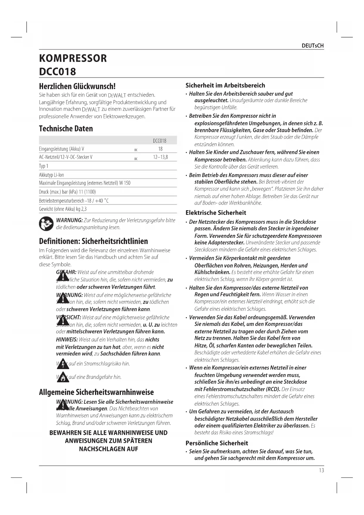 - Seien Sie aufmerksam, achten Sie darauf, was Sie tun, und gehen Sie sachgerecht mit dem Kompressor um. Herzlichen Glückwunsch! Sie haben sich für ein Gerät von DeWALT entschieden. Langjährige Erfahrung, sorgfältige Produktentwicklung und Innovation machen DeWALT zu einem zuverlässigen Partner für professionelle Anwender vonElektrowerkzeugen. Technische Daten DCC018 Eingangsleistung (Akku) V