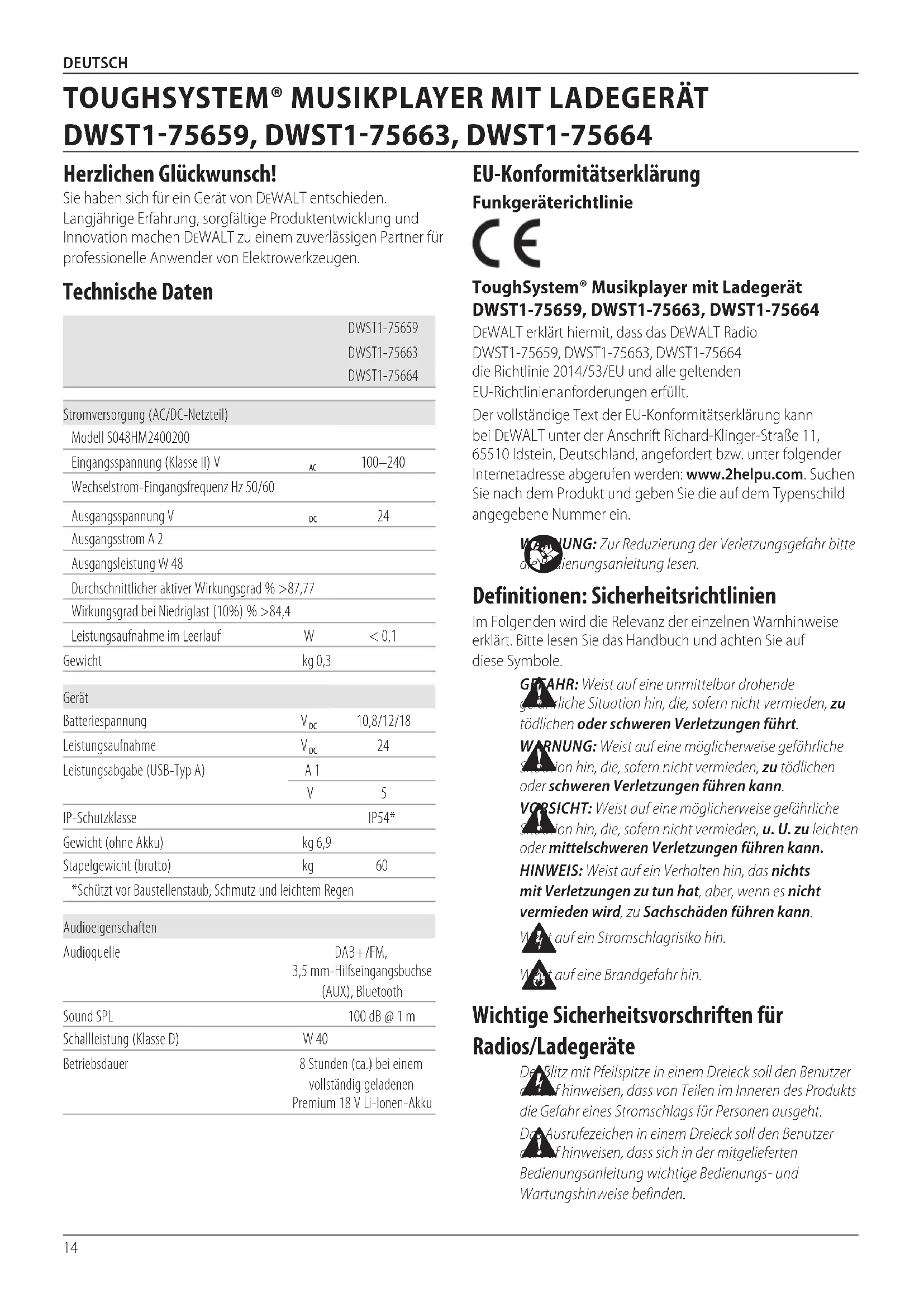 DeWALT erklärt hiermit, dass das DeWALT Radio DWST1-75659, DWST1-75663, DWST1-75664 die Richtlinie 2014/53/EU und alle geltenden EU-Richtlinienanforderungenerfüllt.Der vollständige Text der EU-Konformitätserklärung kann bei DeWALT unter der Anschrift Richard-Klinger-Straße 11, 65510Idstein, Deutschland, angefordert bzw. unter folgender Internetadresse abgerufen werden: www.2helpu.com. Suchen Sie nach dem Produkt und geben Sie die auf dem Typenschild angegebene Nummerein.DWST1-75659DWST1-75663DWST1-75664Stromversorgung (AC/DC-Netzteil)Modell S048HM2400200Eingangsspannung (Klasse II) V 100–240Wechselstrom-Eingangsfrequenz Hz 50/60Ausgangsspannung V