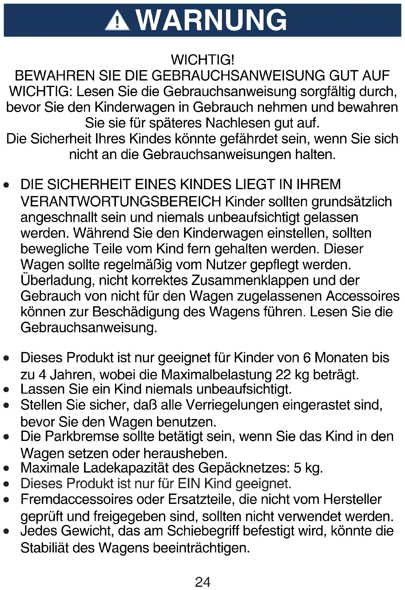 DIE SICHERHEIT EINES KINDES LIEGT IN IHREM VERANTWORTUNGSBEREICH Kinder sollten grundsätzlich angeschnallt sein und niemals unbeaufsichtigt gelassen werden. Während Sie den Kinderwagen einstellen, sollten bewegliche Teile vom Kind fern gehalten werden. Dieser Wagen sollte regelmäßig vom Nutzer gepflegt werden. Überladung, nicht korrektes Zusammenklappen und der Gebrauch von nicht für den Wagen zugelassenen Accessoires können zur Beschädigung des Wagens führen. Lesen Sie die Gebrauchsanweisung.