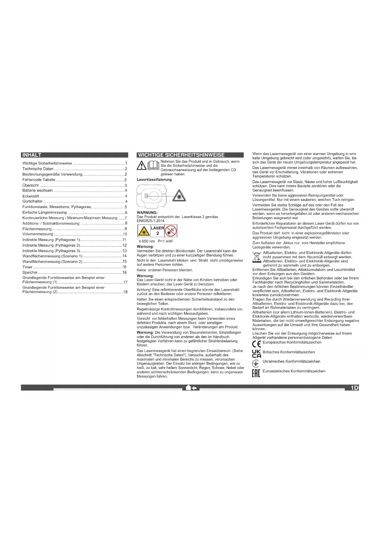 λ 650 nm P<1 mW Warnung: Vermeiden Sie direkten Blickkontakt. Der Laserstrahl kann die Augen verblitzen und zu einer kurzzeitigen Blendung führen. Nicht in den Laserstrahl blicken und Strahl nicht unnötigerweise auf andere Personen richten. Keine anderen Personen blenden. Warnung: Das Laser-Gerät nicht in der Nähe von Kindern betreiben oder Kindern erlauben, das Laser-Gerät zu benutzen. Achtung! Eine reektierende Oberäche könnte den Laserstrahl zurück an den Bediener oder andere Personen reektieren. Halten Sie einen entsprechenden Sicherheitsabstand zu den beweglichen Teilen. Regelmässige Kontrollmessungen durchführen, insbesondere vor, während und nach wichtigen Messaufgaben. Vorsicht vor fehlerhaften Messungen beim Verwenden eines defekten Produkts, nach einem Sturz oder sonstigen unzulässigen Anwendungen bzw. Veränderungen am Produkt. Warnung: Die Verwendung von Steuerelementen, Einstellungen oder die Durchführung von anderen als den im Handbuch festgelegten Verfahren kann zu gefährlicher Strahlenbelastung führen. Das Lasermessgerät hat einen begrenzten Einsatzbereich. (Siehe Abschnitt "Technische Daten"). Versuche, außerhalb des maximalen und minimalen Bereichs zu messen, verursachen Ungenauigkeiten. Der Einsatz bei widrigen Bedingungen, wie zu heiß, zu kalt, sehr hellem Sonnenlicht, Regen, Schnee, Nebel oder anderen sichteinschränkenden Bedingungen, kann zu ungenauen Messungen führen. Wenn das Lasermessgerät von einer warmen Umgebung in eine kalte Umgebung gebracht wird (oder umgekehrt), warten Sie, bis sich das Gerät der neuen Umgebungstemperatur angepasst hat. Das Lasermessgerät immer innerhalb von Räumen aufbewahren, das Gerät vor Erschütterung, Vibrationen oder extremen Temperaturen schützen. Das Lasermessgerät vor Staub, Nässe und hoher Luftfeuchtigkeit schützen. Dies kann innere Bauteile zerstören oder die Genauigkeit beeinussen. Verwenden Sie keine aggressiven Reinigungsmittel oder Lösungsmittel. Nur mit einem sauberen, weichen Tuch reinigen. Vermeiden Sie starke Schläge auf das oder den Fall des Lasermessgeräts. Die Genauigkeit des Gerätes sollte überprüft werden, wenn es heruntergefallen ist oder anderen mechanischen Belastungen ausgesetzt war. Erforderlichen Reparaturen an diesem Laser-Gerät dürfen nur von autorisiertem Fachpersonal durchgeführt werden. Das Produkt darf nicht in einer explosionsgefährdeten oder aggressiven Umgebung eingesetzt werden. Zum Auaden der Akkus nur vom Hersteller empfohlene Ladegeräte verwenden. Altbatterien, Elektro- und Elektronik-Altgeräte dürfen nicht zusammen mit dem Hausmüll entsorgt werden. Altbatterien, Elektro- und Elektronik-Altgeräte sind getrennt zu sammeln und zu entsorgen. Entfernen Sie Altbatterien, Altakkumulatorn und Leuchtmittel vor dem Entsorgen aus den Geräten. Erkundigen Sie sich bei den örtlichen Behörden oder bei Ihrem Fachhändler nach Recyclinghöfen und Sammelstellen. Je nach den örtlichen Bestimmungen können Einzelhändler verpichtet sein, Altbatterien, Elektro- und Elektronik-Altgeräte kostenlos zurückzunehmen. Tragen Sie durch Wiederverwendung und Recycling Ihrer Altbatterien, Elektro- und Elektronik-Altgeräte dazu bei, den Bedarf an Rohmaterialien zu verringern. Altbatterien (vor allem Lithium-Ionen-Batterien), Elektro- und Elektronik-Altgeräte enthalten wertvolle, wiederverwertbare Materialien, die bei nicht umweltgerechter Entsorgung negative Auswirkungen auf die Umwelt und Ihre Gesundheit haben können. Löschen Sie vor der Entsorgung möglicherweise auf Ihrem Altgerät vorhandene personenbezogene Daten. Europäisches Konformitätszeichen Britisches Konformitätszeichen Ukrainisches Konformitätszeichen Euroasiatisches Konformitätszeichen INHALT Wichtige Sicherheitshinweise .................................................1 Technische Daten