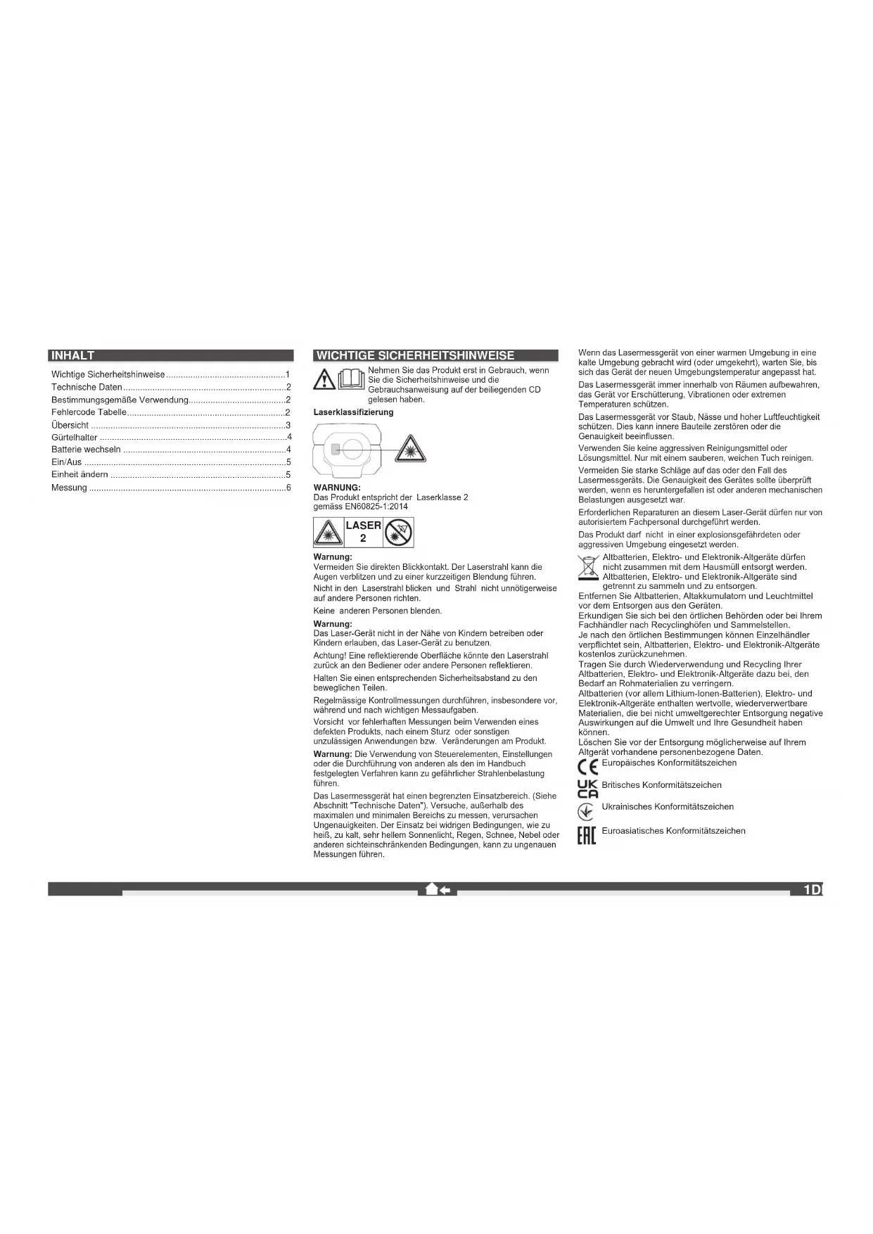 Warnung: Vermeiden Sie direkten Blickkontakt. Der Laserstrahl kann die Augen verblitzen und zu einer kurzzeitigen Blendung führen. Nicht in den Laserstrahl blicken und Strahl nicht unnötigerweise auf andere Personen richten. Keine anderen Personen blenden. Warnung: Das Laser-Gerät nicht in der Nähe von Kindern betreiben oder Kindern erlauben, das Laser-Gerät zu benutzen. Achtung! Eine reektierende Oberäche könnte den Laserstrahl zurück an den Bediener oder andere Personen reektieren. Halten Sie einen entsprechenden Sicherheitsabstand zu den beweglichen Teilen. Regelmässige Kontrollmessungen durchführen, insbesondere vor, während und nach wichtigen Messaufgaben. Vorsicht vor fehlerhaften Messungen beim Verwenden eines defekten Produkts, nach einem Sturz oder sonstigen unzulässigen Anwendungen bzw. Veränderungen am Produkt. Warnung: Die Verwendung von Steuerelementen, Einstellungen oder die Durchführung von anderen als den im Handbuch festgelegten Verfahren kann zu gefährlicher Strahlenbelastung führen. Das Lasermessgerät hat einen begrenzten Einsatzbereich. (Siehe Abschnitt "Technische Daten"). Versuche, außerhalb des maximalen und minimalen Bereichs zu messen, verursachen Ungenauigkeiten. Der Einsatz bei widrigen Bedingungen, wie zu heiß, zu kalt, sehr hellem Sonnenlicht, Regen, Schnee, Nebel oder anderen sichteinschränkenden Bedingungen, kann zu ungenauen Messungen führen. Wenn das Lasermessgerät von einer warmen Umgebung in eine kalte Umgebung gebracht wird (oder umgekehrt), warten Sie, bis sich das Gerät der neuen Umgebungstemperatur angepasst hat. Das Lasermessgerät immer innerhalb von Räumen aufbewahren, das Gerät vor Erschütterung, Vibrationen oder extremen Temperaturen schützen. Das Lasermessgerät vor Staub, Nässe und hoher Luftfeuchtigkeit schützen. Dies kann innere Bauteile zerstören oder die Genauigkeit beeinussen. Verwenden Sie keine aggressiven Reinigungsmittel oder Lösungsmittel. Nur mit einem sauberen, weichen Tuch reinigen. Vermeiden Sie starke Schläge auf das oder den Fall des Lasermessgeräts. Die Genauigkeit des Gerätes sollte überprüft werden, wenn es heruntergefallen ist oder anderen mechanischen Belastungen ausgesetzt war. Erforderlichen Reparaturen an diesem Laser-Gerät dürfen nur von autorisiertem Fachpersonal durchgeführt werden. Das Produkt darf nicht in einer explosionsgefährdeten oder aggressiven Umgebung eingesetzt werden. Altbatterien, Elektro- und Elektronik-Altgeräte dürfen nicht zusammen mit dem Hausmüll entsorgt werden. Altbatterien, Elektro- und Elektronik-Altgeräte sind getrennt zu sammeln und zu entsorgen. Entfernen Sie Altbatterien, Altakkumulatorn und Leuchtmittel vor dem Entsorgen aus den Geräten. Erkundigen Sie sich bei den örtlichen Behörden oder bei Ihrem Fachhändler nach Recyclinghöfen und Sammelstellen. Je nach den örtlichen Bestimmungen können Einzelhändler verpichtet sein, Altbatterien, Elektro- und Elektronik-Altgeräte kostenlos zurückzunehmen. Tragen Sie durch Wiederverwendung und Recycling Ihrer Altbatterien, Elektro- und Elektronik-Altgeräte dazu bei, den Bedarf an Rohmaterialien zu verringern. Altbatterien (vor allem Lithium-Ionen-Batterien), Elektro- und Elektronik-Altgeräte enthalten wertvolle, wiederverwertbare Materialien, die bei nicht umweltgerechter Entsorgung negative Auswirkungen auf die Umwelt und Ihre Gesundheit haben können. Löschen Sie vor der Entsorgung möglicherweise auf Ihrem Altgerät vorhandene personenbezogene Daten. Europäisches Konformitätszeichen Britisches Konformitätszeichen Ukrainisches Konformitätszeichen Euroasiatisches Konformitätszeichen INHALT Wichtige Sicherheitshinweise .................................................1 Technische Daten