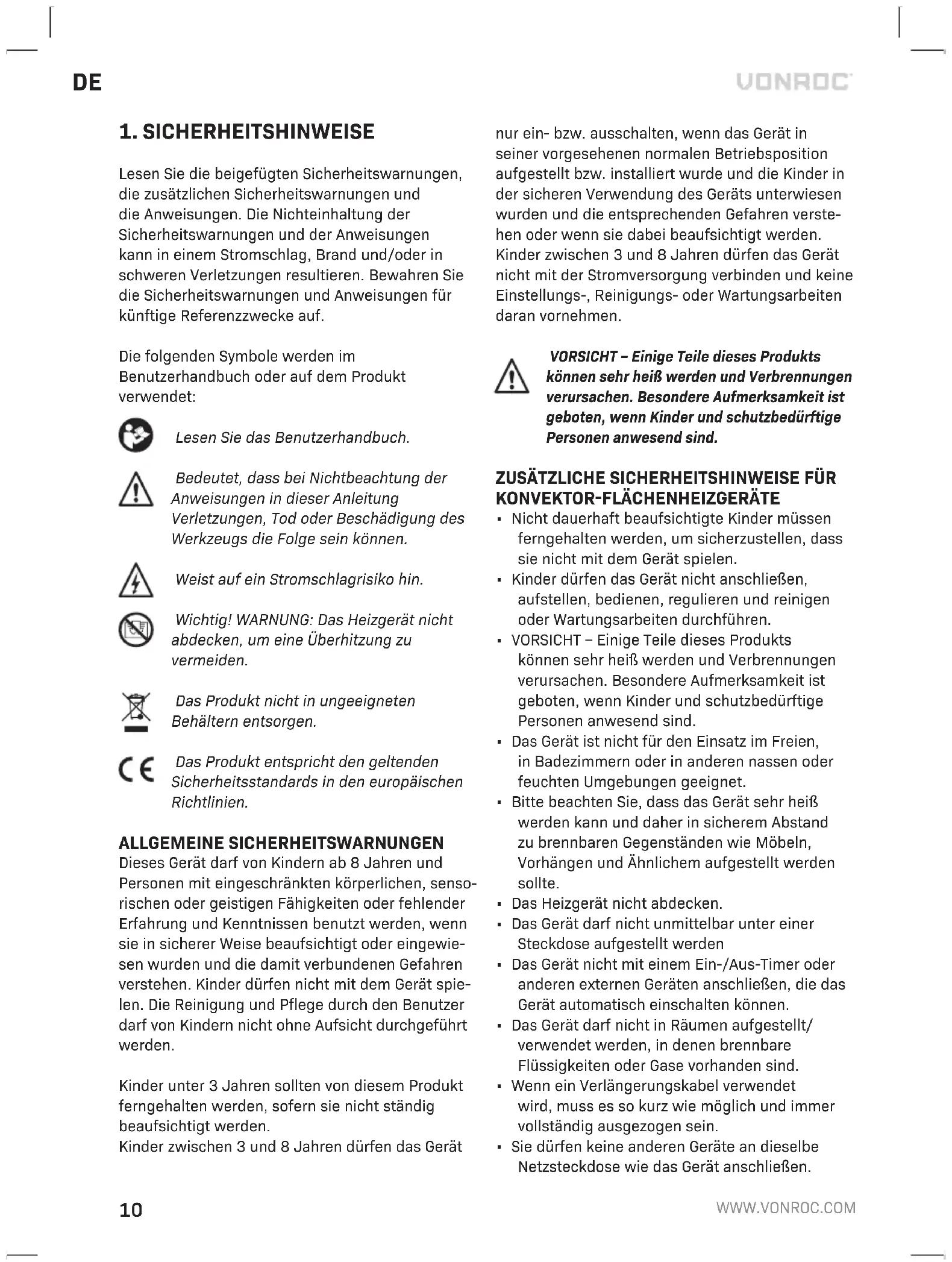 Lesen Sie die beigefügten Sicherheitswarnungen, die zusätzlichen Sicherheitswarnungen und die Anweisungen. Die Nichteinhaltung der Sicherheitswarnungen und der Anweisungen kann in einem Stromschlag, Brand und/oder in schweren Verletzungen resultieren. Bewahren Sie die Sicherheitswarnungen und Anweisungen für künftige Referenzzwecke auf. Die folgenden Symbole werden im Benutzerhandbuch oder auf dem Produkt verwendet: Lesen Sie das Benutzerhandbuch. Bedeutet, dass bei Nichtbeachtung der Anweisungen in dieser Anleitung Verletzungen, Tod oder Beschädigung des Werkzeugs die Folge sein können. Weist auf ein Stromschlagrisiko hin. Wichtig! WARNUNG: Das Heizgerät nicht abdecken, um eine Überhitzung zu vermeiden. Das Produkt nicht in ungeeigneten Behältern entsorgen. Das Produkt entspricht den geltenden Sicherheitsstandards in den europäischen Richtlinien. ALLGEMEINE SICHERHEITSWARNUNGEN Dieses Gerät darf von Kindern ab 8 Jahren und Personen mit eingeschränkten körperlichen, senso- rischen oder geistigen Fähigkeiten oder fehlender Erfahrung und Kenntnissen benutzt werden, wenn sie in sicherer Weise beaufsichtigt oder eingewie- sen wurden und die damit verbundenen Gefahren verstehen. Kinder dürfen nicht mit dem Gerät spie- len. Die Reinigung und Pflege durch den Benutzer darf von Kindern nicht ohne Aufsicht durchgeführt werden. Kinder unter 3 Jahren sollten von diesem Produkt ferngehalten werden, sofern sie nicht ständig beaufsichtigt werden. Kinder zwischen 3 und 8 Jahren dürfen das Gerät nur ein- bzw. ausschalten, wenn das Gerät in seiner vorgesehenen normalen Betriebsposition aufgestellt bzw. installiert wurde und die Kinder in der sicheren Verwendung des Geräts unterwiesen wurden und die entsprechenden Gefahren verste- hen oder wenn sie dabei beaufsichtigt werden. Kinder zwischen 3 und 8 Jahren dürfen das Gerät nicht mit der Stromversorgung verbinden und keine Einstellungs-, Reinigungs- oder Wartungsarbeiten daran vornehmen. VORSICHT – Einige Teile dieses Produkts können sehr heiß werden und Verbrennungen verursachen. Besondere Aufmerksamkeit ist geboten, wenn Kinder und schutzbedürftige Personen anwesend sind.