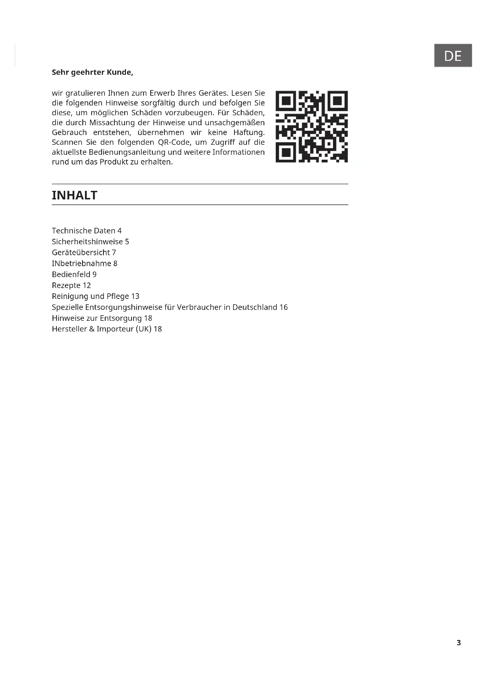 Sehr geehrter Kunde, wir gratulieren Ihnen zum Erwerb Ihres Gerätes. Lesen Sie die folgenden Hinweise sorgfältig durch und befolgen Sie diese, um möglichen Schäden vorzubeugen. Für Schäden, die durch Missachtung der Hinweise und unsachgemäßen Gebrauch entstehen, übernehmen wir keine Haftung. Scannen Sie den folgenden QR-Code, um Zugriff auf die aktuellste Bedienungsanleitung und weitere Informationen rund um das Produkt zu erhalten. Technische Daten 4 Sicherheitshinweise 5 Geräteübersicht 7 INbetriebnahme 8 Bedienfeld 9 Rezepte 12 Reinigung und Pege 13 Spezielle Entsorgungshinweise für Verbraucher in Deutschland 16 Hinweise zur Entsorgung 18 Hersteller & Importeur (UK) 18 INHALT4