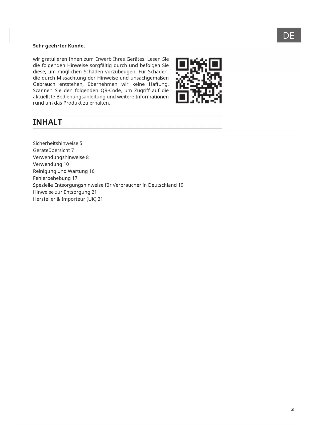 Sehr geehrter Kunde, wir gratulieren Ihnen zum Erwerb Ihres Gerätes. Lesen Sie die folgenden Hinweise sorgfältig durch und befolgen Sie diese, um möglichen Schäden vorzubeugen. Für Schäden, die durch Missachtung der Hinweise und unsachgemäßen Gebrauch entstehen, übernehmen wir keine Haftung. Scannen Sie den folgenden QR-Code, um Zugriff auf die aktuellste Bedienungsanleitung und weitere Informationen rund um das Produkt zu erhalten. Sicherheitshinweise 5 Geräteübersicht 7 Verwendungshinweise 8 Verwendung 10 Reinigung und Wartung 16 Fehlerbehebung 17 Spezielle Entsorgungshinweise für Verbraucher in Deutschland 19 Hinweise zur Entsorgung 21 Hersteller & Importeur (UK) 21 INHALT4