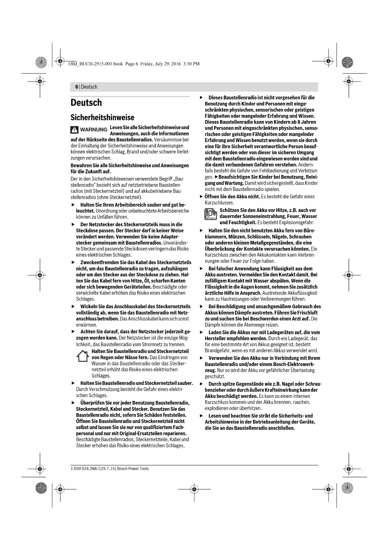OBJ_BUCH-2915-001.book Page 5 Friday, July 29, 2016 3:30 PM6 | Deutsch 1 609 92A 2NA | (29.7.16) Bosch Power Tools Deutsch Sicherheitshinweise Lesen Sie alle Sicherheitshinweise und Anweisungen, auch die Informationen auf der Rückseite des Baustellenradios. Versäumnisse bei der Einhaltung der Sicherheitshinweise und Anweisungen können elektrischen Schlag, Brand und/oder schwere Verlet- zungen verursachen. Bewahren Sie alle Sicherheitshinweise und Anweisungen für die Zukunft auf. Der in den Sicherheitshinweisen verwendete Begriff „Bau- stellenradio“ bezieht sich auf netzbetriebene Baustellen- radios (mit Steckernetzteil) und auf akkubetriebene Bau- stellenradios (ohne Steckernetzteil). Halten Sie Ihren Arbeitsbereich sauber und gut be- leuchtet. Unordnung oder unbeleuchtete Arbeitsbereiche können zu Unfällen führen. Der Netzstecker des Steckernetzteils muss in die Steckdose passen. Der Stecker darf in keiner Weise verändert werden. Verwenden Sie keine Adapter- stecker gemeinsam mit Baustellenradios. Unveränder- te Stecker und passende Steckdosen verringern das Risiko eines elektrischen Schlages. Zweckentfremden Sie das Kabel des Steckernetzteils nicht, um das Baustellenradio zu tragen, aufzuhängen oder um den Stecker aus der Steckdose zu ziehen. Hal- ten Sie das Kabel fern von Hitze, Öl, scharfen Kanten oder sich bewegenden Geräteteilen. Beschädigte oder verwickelte Kabel erhöhen das Risiko eines elektrischen Schlages. Wickeln Sie das Anschlusskabel des Steckernetzteils vollständig ab, wenn Sie das Baustellenradio mit Netz- anschluss betreiben. Das Anschlusskabel kann sich sonst erwärmen. Achten Sie darauf, dass der Netzstecker jederzeit ge- zogen werden kann. Der Netzstecker ist die einzige Mög- lichkeit, das Baustellenradio vom Stromnetz zu trennen. Halten Sie Baustellenradio und Steckernetzteil von Regen oder Nässe fern. Das Eindringen von Wasser in das Baustellenradio oder das Stecker- netzteil erhöht das Risiko eines elektrischen Schlages. Halten Sie Baustellenradio und Steckernetzteil sauber. Durch Verschmutzung besteht die Gefahr eines elektri- schen Schlages. Überprüfen Sie vor jeder Benutzung Baustellenradio, Steckernetzteil, Kabel und Stecker. Benutzen Sie das Baustellenradio nicht, sofern Sie Schäden feststellen. Öffnen Sie Baustellenradio und Steckernetzteil nicht selbst und lassen Sie sie nur von qualifiziertem Fach- personal und nur mit Original-Ersatzteilen reparieren. Beschädigte Baustellenradios, Steckernetzteile, Kabel und Stecker erhöhen das Risiko eines elektrischen Schlages. Dieses Baustellenradio ist nicht vorgesehen für die Benutzung durch Kinder und Personen mit einge- schränkten physischen, sensorischen oder geistigen Fähigkeiten oder mangelnder Erfahrung und Wissen. Dieses Baustellenradio kann von Kindern ab 8 Jahren und Personen mit eingeschränkten physischen, senso- rischen oder geistigen Fähigkeiten oder mangelnder Erfahrung und Wissen benutzt werden, wenn sie durch eine für ihre Sicherheit verantwortliche Person beauf- sichtigt werden oder von dieser im sicheren Umgang mit dem Baustellenradio eingewiesen worden sind und die damit verbundenen Gefahren verstehen. Andern- falls besteht die Gefahr von Fehlbedienung und Verletzun- gen.Beaufsichtigen Sie Kinder bei Benutzung, Reini- gung und Wartung. Damit wird sichergestellt, dass Kinder nicht mit dem Baustellenradio spielen. Öffnen Sie den Akku nicht. Es besteht die Gefahr eines Kurzschlusses. Schützen Sie den Akku vor Hitze, z.B. auch vor dauernder Sonneneinstrahlung, Feuer, Wasser und Feuchtigkeit. Es besteht Explosionsgefahr. Halten Sie den nicht benutzten Akku fern von Büro- klammern, Münzen, Schlüsseln, Nägeln, Schrauben oder anderen kleinen Metallgegenständen, die eine Überbrückung der Kontakte verursachen könnten. Ein Kurzschluss zwischen den Akkukontakten kann Verbren- nungen oder Feuer zur Folge haben. Bei falscher Anwendung kann Flüssigkeit aus dem Akku austreten. Vermeiden Sie den Kontakt damit. Bei zufälligem Kontakt mit Wasser abspülen. Wenn die Flüssigkeit in die Augen kommt, nehmen Sie zusätzlich ärztliche Hilfe in Anspruch. Austretende Akkuflüssigkeit kann zu Hautreizungen oder Verbrennungen führen. Bei Beschädigung und unsachgemäßem Gebrauch des Akkus können Dämpfe austreten. Führen Sie Frischluft zu und suchen Sie bei Beschwerden einen Arzt auf. Die Dämpfe können die Atemwege reizen. Laden Sie die Akkus nur mit Ladegeräten auf, die vom Hersteller empfohlen werden. Durch ein Ladegerät, das für eine bestimmte Art von Akkus geeignet ist, besteht Brandgefahr, wenn es mit anderen Akkus verwendet wird. Verwenden Sie den Akku nur in Verbindung mit Ihrem Baustellenradio und/oder einem Bosch-Elektrowerk- zeug. Nur so wird der Akku vor gefährlicher Überlastung geschützt. Durch spitze Gegenstände wie z.B. Nagel oder Schrau- benzieher oder durch äußere Krafteinwirkung kann der Akku beschädigt werden. Es kann zu einem internen Kurzschluss kommen und der Akku brennen, rauchen, explodieren oder überhitzen. Lesen und beachten Sie strikt die Sicherheits- und Arbeitshinweise in der Betriebsanleitung der Geräte, die Sie an das Baustellenradio anschließen. WARNUNG OBJ_BUCH-2915-001.book Page 6 Friday, July 29, 2016 3:30 PMDeutsch | 7 Bosch Power Tools 1 609 92A 2NA | (29.7.16) Produkt- und Leistungsbeschreibung Lesen Sie alle Sicherheitshinweise und An- weisungen. Versäumnisse bei der Einhaltung der Sicherheitshinweise und Anweisungen können elektrischen Schlag, Brand und/oder schwere Verletzungen verursachen. Bitte klappen Sie die Aufklappseite mit der Darstellung des Baustellenradios auf, und lassen Sie diese Seite aufgeklappt, während Sie die Betriebsanleitung lesen. Abgebildete Komponenten Die Nummerierung der abgebildeten Komponenten bezieht sich auf die Darstellung des Baustellenradios auf der Grafik- seite. 1 Tragegriff 2 Lautsprecher 3 Ein-Aus-Taste 4 Taste für manuelle Klangeinstellung „Equalizer“ 5 Taste Lautstärke/Tiefen/H