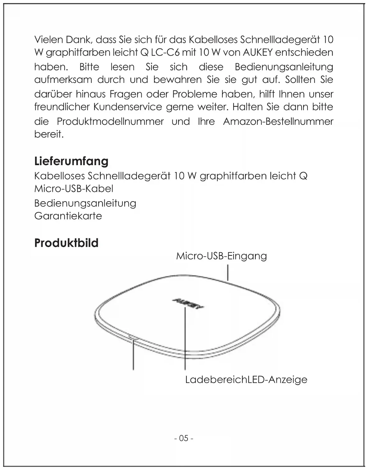 Vielen Dank, dass Sie sich für das Kabelloses Schnelladegerät 10 W graphitfarben leicht Q LC-C6 mit 10 W von AUKEY entschieden haben.itte lessen Sie sich diese Bedienungsanleitung aufmerksam durch und bewahren Sie sie gut auf. Sollten Sie darüber hinaus Fragen oder Probleme haben, hilft Ihnen unser freundlicher Kundenservice gelene weiter. Halten Sie dannitte die Produktmodellnummer und ihre Amazon-Bestellnummer bereit.