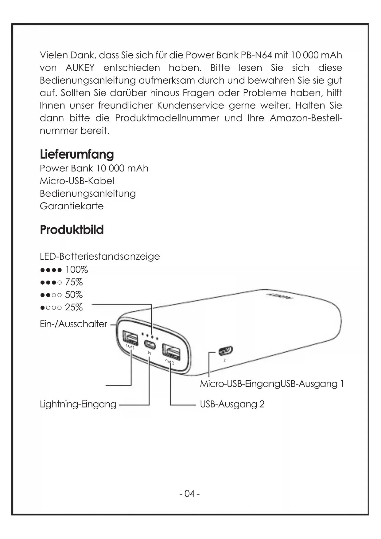 Ein-/Ausschalter Micro-USB-EingangUSB-Ausgang 1 USB-Ausgang 2 LED-Batteriestandsanzeige ●●●● 100% ●●●○ 75% ●●○○ 50% ●○○○ 25% Lightning-Eingang Vielen Dank, dass Sie sich für die Power Bank PB-N64 mit 10 000 mAh von AUKEY entschieden haben. Bitte lesen Sie sich diese Bedienungsanleitung aufmerksam durch und bewahren Sie sie gut auf. Sollten Sie darüber hinaus Fragen oder Probleme haben, hilft Ihnen unser freundlicher Kundenservice gerne weiter. Halten Sie dann bitte die Produktmodellnummer und Ihre Amazon-Bestell- nummer bereit. Lieferumfang Power Bank 10 000 mAh Micro-USB-Kabel Bedienungsanleitung Garantiekarte Produktbild - 04 -- 05 - Technische Daten Modell Technologie Kapazität Batterietyp Lightning-Eingang Micro-USB-Eingang USB-Ausgang 1/2 Abmessungen Gewicht PB-N64 AiPower 10 000 mAh/37 Wh Lithium-Polymer 5 V, 2 A (Gleichstrom) 5 V, 2 A (Gleichstrom) 5 V, 2,4 A (insgesamt 5 V, 3,4 A, Gleichstrom) 107 x 69 x 24 mm 182 g Erste Schritte Laden der Power Bank Laden Sie die Power Bank vor der ersten Verwendung vollständig auf.