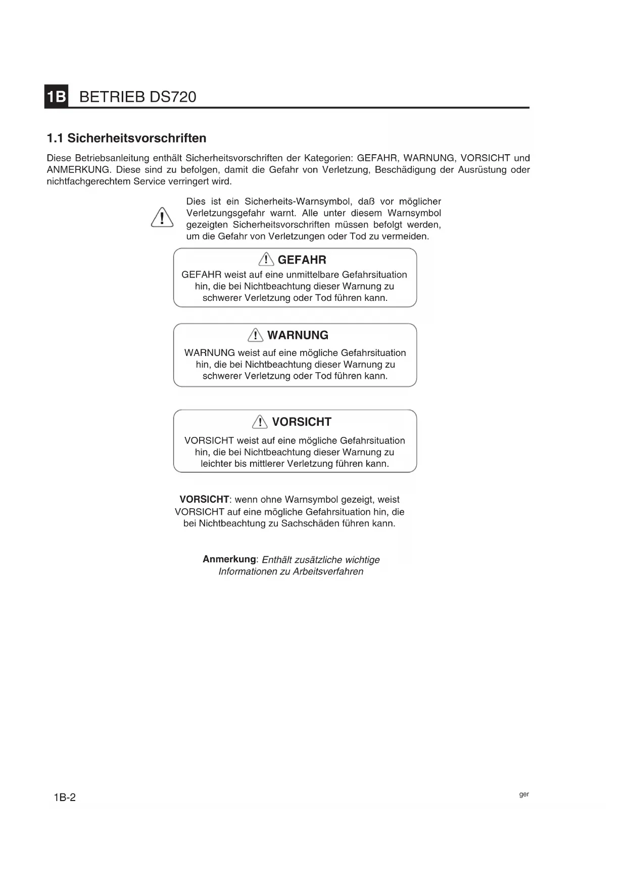 Diese Betriebsanleitung enthält Sicherheitsvorschriften der Kategorien: GEFAHR, WARNUNG, VORSICHT und ANMERKUNG. Diese sind zu befolgen, damit die Gefahr von Verletzung, Beschädigung der Ausrüstung oder nichtfachgerechtem Service verringert wird.VORSICHT: wenn ohne Warnsymbol gezeigt, weistVORSICHT auf eine mögliche Gefahrsituation hin, diebei Nichtbeachtung zu Sachschäden führen kann.Anmerkung: Enthält zusätzliche wichtige Informationen zu Arbeitsverfahren Dies ist ein Sicherheits-Warnsymbol, daß vor möglicher Verletzungsgefahr warnt. Alle unter diesem Warnsymbolgezeigten Sicherheitsvorschriften müssen befolgt werden,um die Gefahr von Verletzungen oder Tod zu vermeiden.GEFAHR weist auf eine unmittelbare Gefahrsituationhin, die bei Nichtbeachtung dieser Warnung zuschwerer Verletzung oder Tod führen kann.VORSICHT weist auf eine mögliche Gefahrsituationhin, die bei Nichtbeachtung dieser Warnung zuleichter bis mittlerer Verletzung führen kann.WARNUNG weist auf eine mögliche Gefahrsituationhin, die bei Nichtbeachtung dieser Warnung zuschwerer Verletzung oder Tod führen kann. GEFAHR