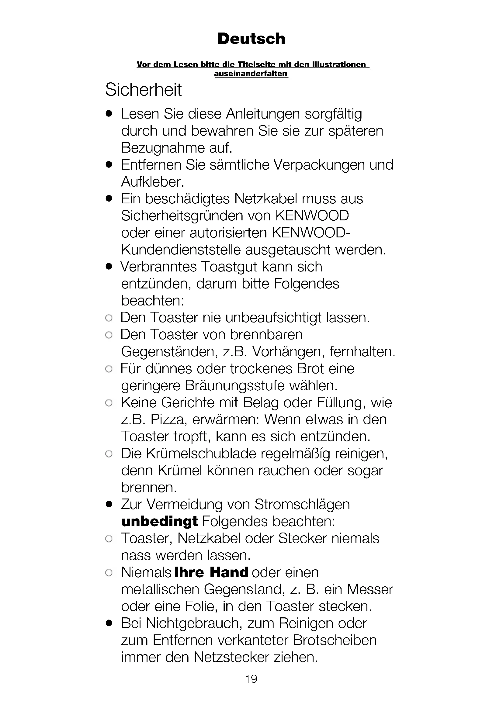 Das Gerät nur für seinen vorgesehenen Zweck im Haushalt verwenden. Kenwood übernimmt keine Haftung bei unsachgemäßer Benutzung des Geräts oder Nichteinhaltung dieser Anleitungen. Vor dem Anschluss Sicherstellen, dass die Netzspannung den Angaben auf der Unterseite des Toasters entspricht. WARNUNG: DIESES GERÄT MUSS GEERDET SEIN. Das Gerät entspricht der EG-Verordnung Nr. 1935/2004 über Materialien und Gegenstände, die dazu bestimmt sind, mit Lebensmitteln in Berührung zu kommen. Vor dem ersten Gebrauch Wickeln Sie überschüssiges Kabel um die Kabelhalter auf der Unterseite