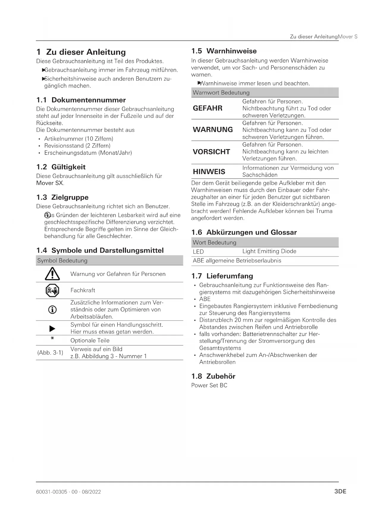 Inhaltsverzeichnis 1 Zu dieser Anleitung 3 11 Dokumentennummer 3 12 Gültigkeit 3 13 Zielgruppe 3 14 Symbole und Darstellungsmittel 3 15 Warnhinweise 3 16 Abkürzungen und Glossar 3 17 Lieferumfang 3 18 Zubehör 3 2 Sicherheitshinweise 4 21 Allgemeine Sicherheit 4 22 Pflichten des Betreibers/ Fahrzeughalters 4 23 Sicherer Betrieb 4 24 Verhalten bei Störungen 5 3 Verwendungszweck 5 31 Bestimmungsgemäße Verwendung 5 32 Nicht bestimmungsgemäße Verwendung 5 33 Einbau, Ausbau, Umbau 5 4 Produktbeschreibung 6 41 Aufbau 6 42 Produktkennzeichnung 7 43 Funktion 7 44 Stromversorgung 7 45 Fernbedienung 7 5 Bedienung 10 51 Abkuppeln vom Zugfahrzeug 10 52 Rangiersystem einschalten 10 53 Rangiersystem anschwenken 11 54 Wohnwagen rangieren 12 55 Ankuppeln am Zugfahrzeug 13 56 Rangiersystem abschwenken 14 57 Rangiersystem ausschalten 14 6 Störungen 15 61 Fehlersuche 15 62 Abstimmung der elektronischen Steuerung mit der Funk-Fernbedienung 16 7 Pflege und Wartung 17 71 Pflege der 12V Batterie 17 72 Pflege der Fernbedienung 17 73 Pflege der Reifen 17 74 Pflege der Antriebseinheit 17 75 Wartung Rangiersystem 17 76 Wartung Reifen 17 77 Wartung Steuerung 18 78 Abstandsprüfung Rolle und Reifen 18 79 Längerer Stillstand 18 8 Reparatur 18 9 Entsorgung und Recycling 19 91 Entsorgung des Rangiersystems 19 92 Entsorgung von Fernbedienung und Batterien 19 10 Technische Daten 19 11 Garantie 20 111 Umfang der Herstellergarantie 20 112 Ausschluss der Garantie 20 113 Geltendmachung der Garantie 2160031-00305 ∙ 00 ∙ 08/2022 Zu dieser AnleitungMover SX 3DE 1 Zu dieser Anleitung Diese Gebrauchsanleitung ist Teil des Produktes Gebrauchsanleitung immer im Fahrzeug mitführen Sicherheitshinweise auch anderen Benutzern zu- gänglich machen