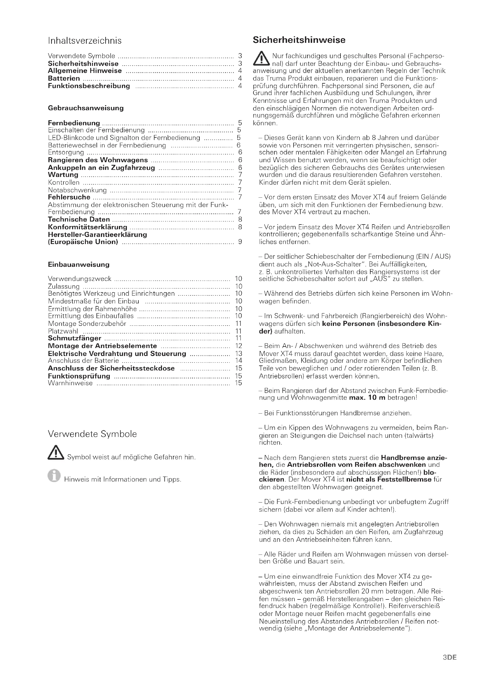 - Bild 13DE Sicherheitshinweise Nur fachkundiges und geschultes Personal (Fachperso- nal) darfunter Beachtung der Einbau- und Gebrauchs- anweisung und der aktuellen anerkannten Regeln der Technik das Truma Produkt einbauen, reparieren und die Funktions- prüfung durchführen. Fachpersonal sind Personen, die auf Grund ihrer fachlichen Ausbildung und Schulungen, ihrer Kenntnisse und Erfahrungen mit den Truma Produkten und den einschlägigen Normen die notwendigen Arbeiten ord- nungsgemäß durchführen und mögliche Gefahren erkennen können. – Dieses Gerät kann von Kindern ab 8 Jahren und darüber sowie von Personen mit verringerten physischen, sensori- schen oder mentalen Fähigkeiten oder Mangel an Erfahrung und Wissen benutzt werden, wenn sie beaufsichtigt oder bezüglich des sicheren Gebrauchs des Gerätes unterwiesen wurden und die daraus resultierenden Gefahren verstehen. Kinder dürfen nicht mit dem Gerät spielen. – Vor dem ersten Einsatz des MoverXT4 auf freiem Gelände üben, um sich mit den Funktionen der Fernbedienung bzw. des MoverXT4 vertraut zu machen. – Vor jedem Einsatz des MoverXT4 Reifen und Antriebsrollen kontrollieren; gegebenenfalls scharfkantige Steine und Ähn- liches entfernen. – Der seitlicher Schiebeschalter der Fernbedienung (EIN / AUS) dient auch als „Not-Aus-Schalter“. Bei Auffälligkeiten, z. B. unkontrolliertes Verhalten des Rangiersystems ist der seitliche Schiebeschalter sofort auf „AUS“ zu stellen. – Während des Betriebs dürfen sich keine Personen im Wohn- wagen befinden. – Im Schwenk- und Fahrbereich (Rangierbereich) des Wohn- wagens dürfen sich keine Personen (insbesondere Kin- der) aufhalten. – Beim An- / Abschwenken und während des Betrieb des MoverXT4 muss darauf geachtet werden, dass keine Haare, Gliedmaßen, Kleidung oder andere am Körper befindlichen Teile von beweglichen und/ oder rotierenden Teilen (z. B. Antriebsrollen) erfasst werden können. – Beim Rangieren darf der Abstand zwischen Funk-Fernbedie- nung und Wohnwagenmitte max. 10 m betragen! – Bei Funktionsstörungen Handbremse anziehen. – Um ein Kippen des Wohnwagens zu vermeiden, beim Ran- gieren an Steigungen die Deichsel nach unten (talwärts) richten. – Nach dem Rangieren stets zuerst die Handbremse anzie- hen, die Antriebsrollen vom Reifen abschwenken und die Räder (insbesondere auf abschüssigen Flächen!) blo- ckieren. Der MoverXT4 ist nicht als Feststellbremse für den abgestellten Wohnwagen geeignet. – Die Funk-Fernbedienung unbedingt vor unbefugtem Zugriff sichern (dabei vor allem auf Kinder achten!). – Den Wohnwagen niemals mit angelegten Antriebsrollen ziehen, da dies zu Schäden an den Reifen, am Zugfahrzeug und an den Antriebseinheiten führen kann. – Alle Räder und Reifen am Wohnwagen müssen von dersel- ben Größe und Bauart sein. – Um eine einwandfreie Funktion des MoverXT4 zu ge- währleisten, muss der Abstand zwischen Reifen und abgeschwenk ten Antriebsrollen 20 mm betragen. Alle Rei- fen müssen – gemäß Herstellerangaben – den gleichen Rei- fendruck haben (regelmäßige Kontrolle!). Reifenverschleiß oder Montage neuer Reifen macht gegebenenfalls eine Neueinstellung des Abstandes Antriebsrollen / Reifen not- wendig (siehe „Montage der Antriebselemente“). Inhaltsverzeichnis Verwendete Symbole p. 3