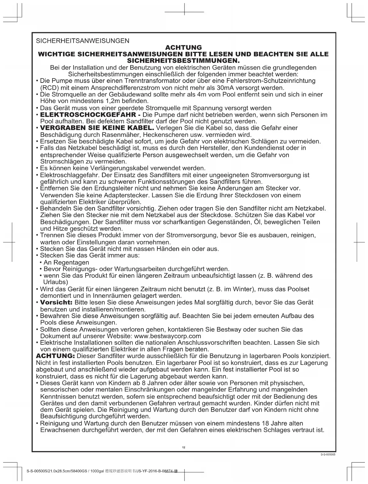 GEBRAUCHSANLEITUNG #58400 Hmax 1.5m www.bestwaycorp.com Besuchen Sie den YouTube-Kanal von BestwayS-S-005005 S-S-005005/21.0x28.5cm/58400GS / 1000gal 德规砂滤器说明书/JS-YF-2016-B-08874-德