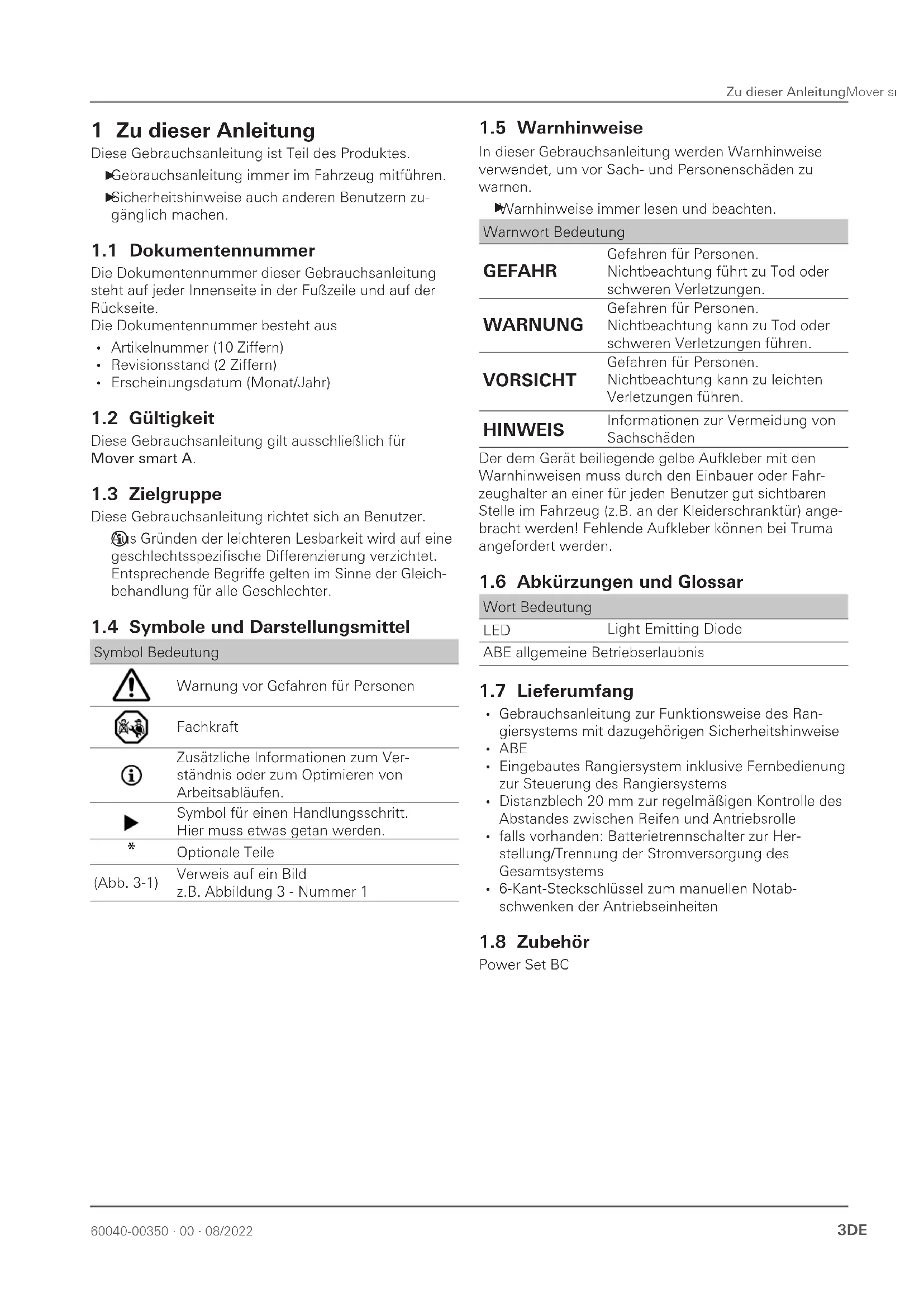 Inhaltsverzeichnis 1 Zu dieser Anleitung 3 11 Dokumentennummer 3 12 Gültigkeit 3 13 Zielgruppe 3 14 Symbole und Darstellungsmittel 3 15 Warnhinweise 3 16 Abkürzungen und Glossar 3 17 Lieferumfang 3 18 Zubehör 3 2 Sicherheitshinweise 4 21 Allgemeine Sicherheit 4 22 Pflichten des Betreibers/ Fahrzeughalters 4 23 Sicherer Betrieb 4 24 Verhalten bei Störungen 5 3 Verwendungszweck 5 31 Bestimmungsgemäße Verwendung 5 32 Nicht bestimmungsgemäße Verwendung 5 33 Einbau, Ausbau, Umbau 5 4 Produktbeschreibung 6 41 Aufbau 6 42 Produktkennzeichnung 6 43 Funktion 7 44 Stromversorgung 7 45 Fernbedienung 7 5 Bedienung 9 51 Abkuppeln vom Zugfahrzeug 9 52 Rangiersystem einschalten 9 53 Rangiersystem anschwenken 10 54 Wohnwagen rangieren 11 55 Ankuppeln am Zugfahrzeug 13 56 Rangiersystem abschwenken 13 57 Rangiersystem manuell abschwenken (Notab- schwenken) 14 58 Rangiersystem ausschalten 14 6 Störungen 15 61 Fehlersuche 15 62 Abstimmung der elektronischen Steuerung mit der Funk-Fernbedienung 16 7 Pflege und Wartung 17 71 Pflege der 12V Batterie 17 72 Pflege der Fernbedienung 17 73 Pflege der Reifen 17 74 Pflege der Antriebseinheit 17 75 Wartung Rangiersystem 17 76 Wartung Reifen 17 77 Wartung Steuerung 18 78 Abstandsprüfung Rolle und Reifen 18 79 Längerer Stillstand 18 8 Reparatur 18 9 Entsorgung und Recycling 19 91 Entsorgung des Rangiersystems 19 92 Entsorgung von Fernbedienung und Batterien 19 10 Technische Daten 19 11 Garantie 20 111 Umfang der Herstellergarantie 20 112 Ausschluss der Garantie 20 113 Geltendmachung der Garantie 2160040-00350 ∙ 00 ∙ 08/2022 Zu dieser AnleitungMover smart A 3DE 1 Zu dieser Anleitung Diese Gebrauchsanleitung ist Teil des Produktes Gebrauchsanleitung immer im Fahrzeug mitführen Sicherheitshinweise auch anderen Benutzern zu- gänglich machen