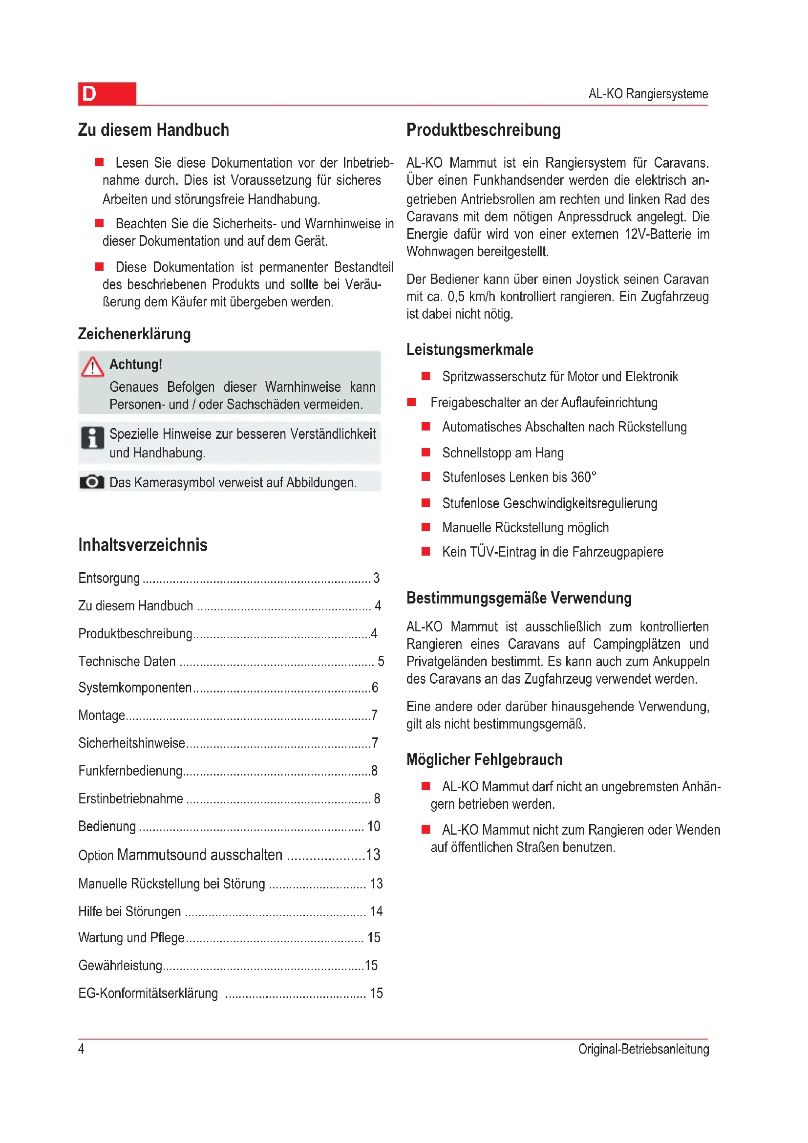 - AL-KO Rangiersysteme Produktbeschreibung AL-KO Mammut ist ein Rangiersystem für Caravans. Über einen Funkhandsender werden die elektrisch an- getrieben Antriebsrollen am rechten und linken Rad des Caravans mit dem nötigen Anpressdruck angelegt. Die Energie dafür wird von einer externen 12V-Batterie im Wohnwagen bereitgestellt. Der Bediener kann über einen Joystick seinen Caravan mit ca. 0,5 km/h kontrolliert rangieren. Ein Zugfahrzeug ist dabei nicht nötig. Leistungsmerkmale Spritzwasserschutz für Motor und Elektronik Freigabeschalter an der Aufl aufeinrichtung Automatisches Abschalten nach Rückstellung Schnellstopp am Hang Stufenloses Lenken bis 360° Stufenlose Geschwindigkeitsregulierung Manuelle Rückstellung möglich Kein TÜV-Eintrag in die Fahrzeugpapiere Bestimmungsgemäße Verwendung AL-KO Mammut ist ausschließlich zum kontrollierten Rangieren eines Caravans auf Campingplätzen und Privatgeländen bestimmt. Es kann auch zum Ankuppeln des Caravans an das Zugfahrzeug verwendet werden. Eine andere oder darüber hinausgehende Verwendung, gilt als nicht bestimmungsgemäß. Möglicher Fehlgebrauch AL-KO Mammut darf nicht an ungebremsten Anhän- gern betrieben werden. AL-KO Mammut nicht zum Rangieren oder Wenden auf öffentlichen Straßen benutzen. Inhaltsverzeichnis Entsorgung p. 3