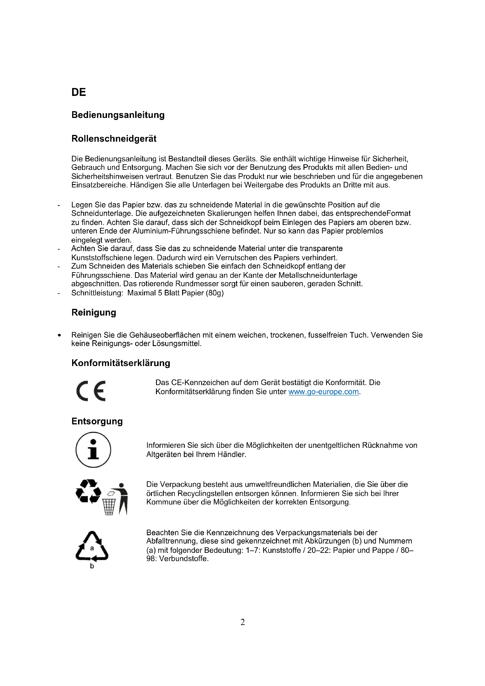 Das CE-Kennzeichen auf dem Gerät bestätigt die Konformität. Die Konformitätserklärung finden Sie unter www.go-europe.com.