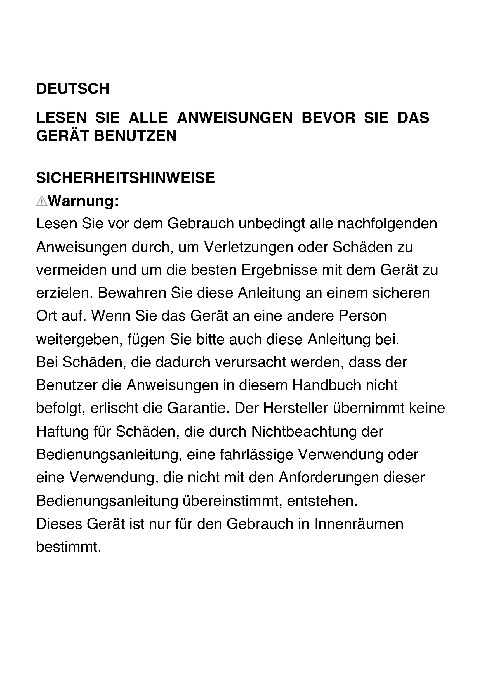 SICHERHEITSHINWEISE Warnung: Lesen Sie vor dem Gebrauch unbedingt alle nachfolgenden Anweisungen durch, um Verletzungen oder Schäden zu vermeiden und um die besten Ergebnisse mit dem Gerät zu erzielen. Bewahren Sie diese Anleitung an einem sicheren Ort auf. Wenn Sie das Gerät an eine andere Person weitergeben, fügen Sie bitte auch diese Anleitung bei. Bei Schäden, die dadurch verursacht werden, dass der Benutzer die Anweisungen in diesem Handbuch nicht befolgt, erlischt die Garantie. Der Hersteller übernimmt keine Haftung für Schäden, die durch Nichtbeachtung der Bedienungsanleitung, eine fahrlässige Verwendung oder eine Verwendung, die nicht mit den Anforderungen dieser Bedienungsanleitung übereinstimmt, entstehen. Dieses Gerät ist nur für den Gebrauch in Innenräumen bestimmt.1.