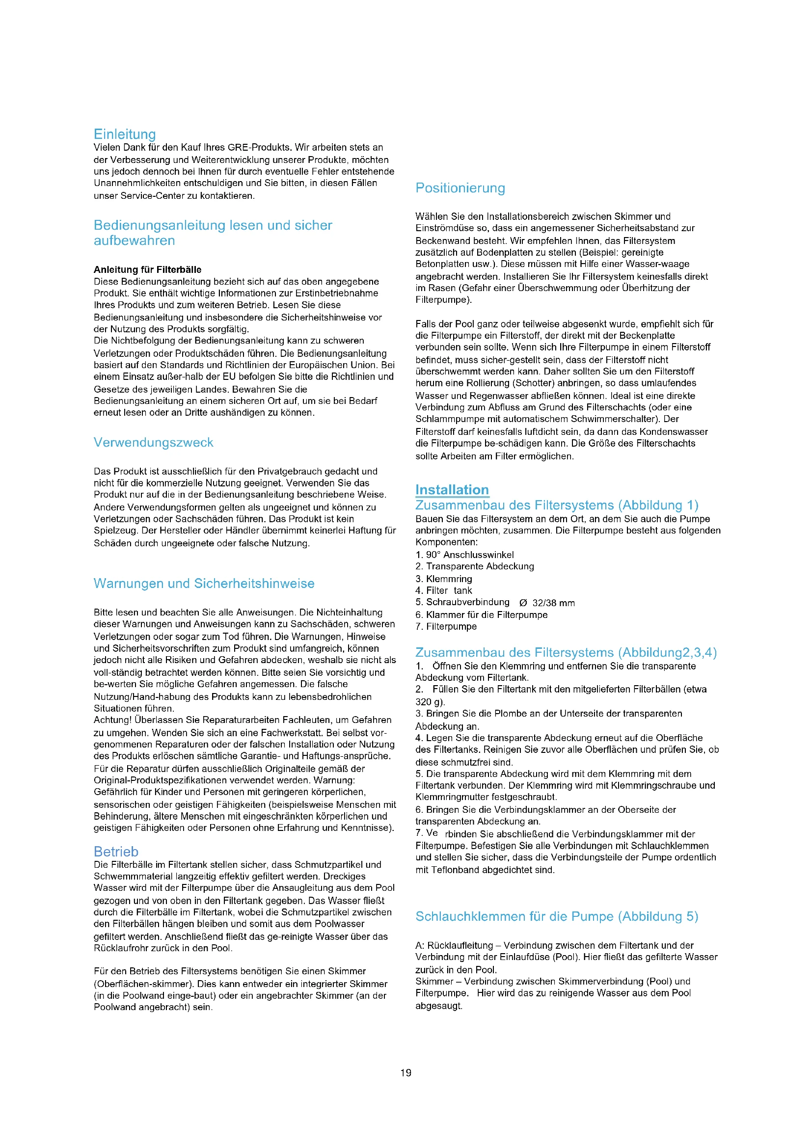 Bitte lesen und beachten Sie alle Anweisungen. Die Nichteinhaltung dieser Warnungen und Anweisungen kann zu Sachschäden, schweren Verletzungen oder sogar zum Tod führen. Die Warnungen, Hinweise und Sicherheitsvorschriften zum Produkt sind umfangreich, können jedoch nicht alle Risiken und Gefahren abdecken, weshalb sie nicht als voll-ständig betrachtet werden können. Bitte seien Sie vorsichtig und be-werten Sie mögliche Gefahren angemessen. Die falsche Nutzung/Hand-habung des Produkts kann zu lebensbedrohlichen Situationen führen. Achtung! Überlassen Sie Reparaturarbeiten Fachleuten, um Gefahren zu umgehen. Wenden Sie sich an eine Fachwerkstatt. Bei selbst vor- genommenen Reparaturen oder der falschen Installation oder Nutzung des Produkts erlöschen sämtliche Garantie- und Haftungs-ansprüche. Für die Reparatur dürfen ausschließlich Originalteile gemäß der Original-Produktspezifikationen verwendet werden. Warnung: Gefährlich für Kinder und Personen mit geringeren körperlichen, sensorischen oder geistigen Fähigkeiten (beispielsweise Menschen mit Behinderung, ältere Menschen mit eingeschränkten körperlichen und geistigen Fähigkeiten oder Personen ohne Erfahrung und Kenntnisse). Betrieb Die Filterbälle im Filtertank stellen sicher, dass Schmutzpartikel und Schwemmmaterial langzeitig effektiv gefiltert werden. Dreckiges Wasser wird mit der Filterpumpe über die Ansaugleitung aus dem Pool gezogen und von oben in den Filtertank gegeben. Das Wasser fließt durch die Filterbälle im Filtertank, wobei die Schmutzpartikel zwischen den Filterbällen hängen bleiben und somit aus dem Poolwasser gefiltert werden. Anschließend fließt das ge-reinigte Wasser über das Rücklaufrohr zurück in den Pool. Für den Betrieb des Filtersystems benötigen Sie einen Skimmer (Oberflächen-skimmer). Dies kann entweder ein integrierter Skimmer (in die Poolwand einge-baut) oder ein angebrachter Skimmer (an der Poolwand angebracht) sein. Positionierung Wählen Sie den Installationsbereich zwischen Skimmer und Einströmdüse so, dass ein angemessener Sicherheitsabstand zur Beckenwand besteht. Wir empfehlen Ihnen, das Filtersystem zusätzlich auf Bodenplatten zu stellen (Beispiel: gereinigte Betonplatten usw.). Diese müssen mit Hilfe einer Wasser-waage angebracht werden. Installieren Sie Ihr Filtersystem keinesfalls direkt im Rasen (Gefahr einer Überschwemmung oder Überhitzung der Filterpumpe). Falls der Pool ganz oder teilweise abgesenkt wurde, empfiehlt sich für die Filterpumpe ein Filterstoff, der direkt mit der Beckenplatte verbunden sein sollte. Wenn sich Ihre Filterpumpe in einem Filterstoff befindet, muss sicher-gestellt sein, dass der Filterstoff nicht überschwemmt werden kann. Daher sollten Sie um den Filterstoff herum eine Rollierung (Schotter) anbringen, so dass umlaufendes Wasser und Regenwasser abfließen können. Ideal ist eine direkte Verbindung zum Abfluss am Grund des Filterschachts (oder eine Schlammpumpe mit automatischem Schwimmerschalter). Der Filterstoff darf keinesfalls luftdicht sein, da dann das Kondenswasser die Filterpumpe be-schädigen kann. Die Größe des Filterschachts sollte Arbeiten am Filter ermöglichen. Installation Zusammenbau des Filtersystems (Abbildung 1) Bauen Sie das Filtersystem an dem Ort, an dem Sie auch die Pumpe anbringen möchten, zusammen. Die Filterpumpe besteht aus folgenden Komponenten:
