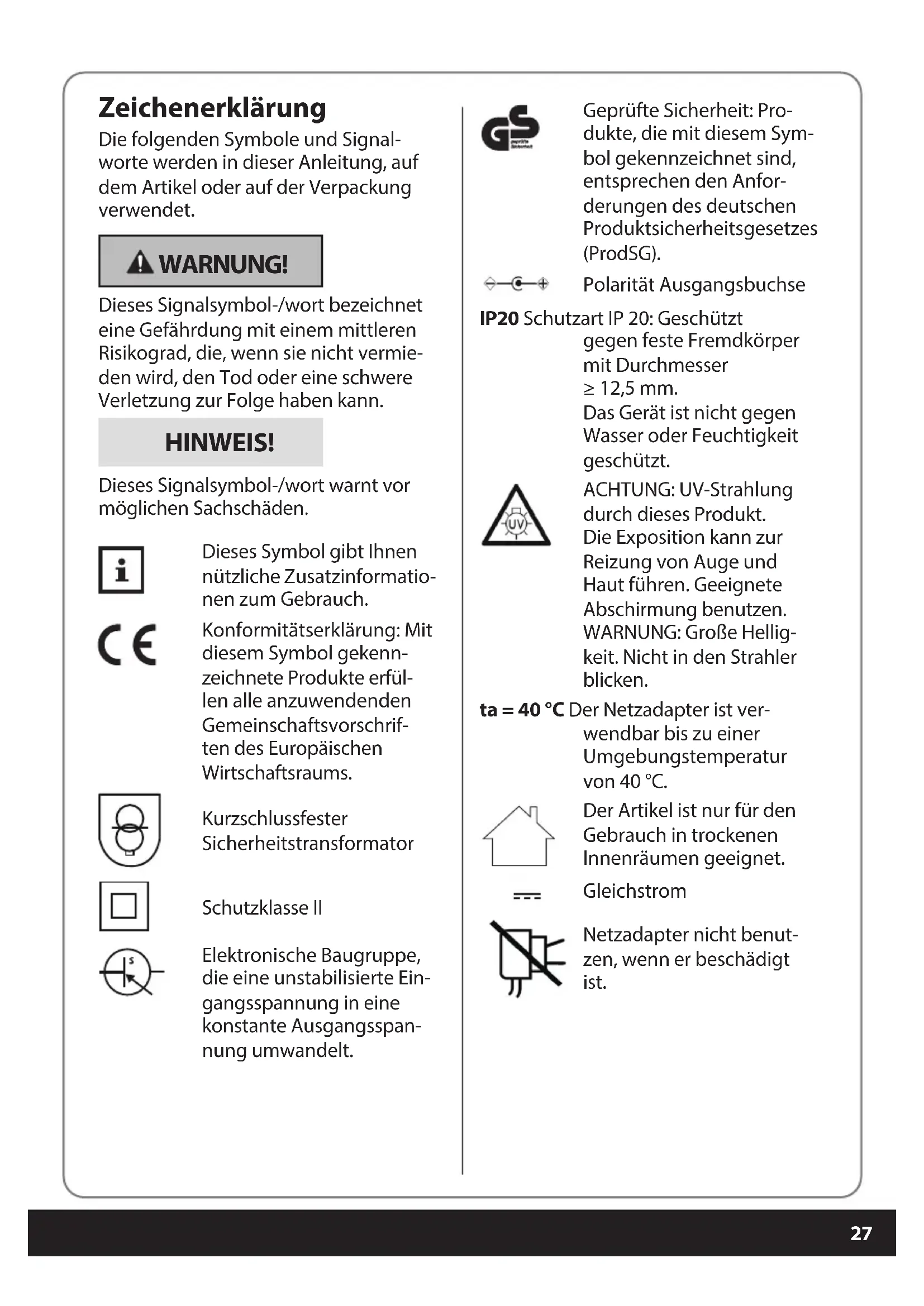 Zeichenerklärung Die folgenden Symbole und Signal- worte werden in dieser Anleitung, auf dem Artikel oder auf der Verpackung verwendet. WARNUNG! Dieses Signalsymbol-/wort bezeichnet eine Gefährdung mit einem mittleren Risikograd, die, wenn sie nicht vermie- den wird, den Tod oder eine schwere Verletzung zur Folge haben kann. HINWEIS! Dieses Signalsymbol-/wort warnt vor möglichen Sachschäden. Dieses Symbol gibt Ihnen nützliche Zusatzinformatio- nen zum Gebrauch. Konformitätserklärung: Mit diesem Symbol gekenn- zeichnete Produkte erfül- len alle anzuwendenden Gemeinschaftsvorschrif- ten des Europäischen Wirtschaftsraums. Kurzschlussfester Sicherheitstransformator Schutzklasse II Elektronische Baugruppe, die eine unstabilisierte Ein- gangsspannung in eine konstante Ausgangsspan- nung umwandelt. Geprüfte Sicherheit: Pro- dukte, die mit diesem Sym- bol gekennzeichnet sind, entsprechen den Anfor- derungen des deutschen Produktsicherheitsgesetzes (ProdSG). Polarität Ausgangsbuchse IP20 Schutzart IP 20: Geschützt gegen feste Fremdkörper mit Durchmesser ≥ 12,5mm. Das Gerät ist nicht gegen Wasser oder Feuchtigkeit geschützt. ACHTUNG: UV-Strahlung durch dieses Produkt. Die Exposition kann zur Reizung von Auge und Haut führen. Geeignete Abschirmung benutzen. WARNUNG: Große Hellig- keit. Nicht in den Strahler blicken. ta = 40 °C Der Netzadapter ist ver- wendbar bis zu einer Umgebungstemperatur von 40 °C. Der Artikel ist nur für den Gebrauch in trockenen Innenräumen geeignet. Gleichstrom Netzadapter nicht benut- zen, wenn er beschädigt ist. Druckbuch Nageltrockner BEL.indb 27Druckbuch Nageltrockner BEL.indb 27 22.03.2022 14:16:3422.03.2022 14:16:3428 Bestimmungsgemäßer Gebrauch Dieser UV-LED-Nageltrockner dient sowohl zur schnelleren Trocknung und Aushärtung von UV-Nagellack und UV- Nagelgel als auch von LED-Nagellack und LED-Nagelgel. Er kann für die Nägel von Hand und Fuß verwendet werden. Für das Aushärten von herkömmlichen Nagellacken und Nagelgelen ist es nicht geeignet. Das Gerät ist für den Privatgebrauch konzipiert. Für die gewerbliche Nutzung, z. B. in Nagelstudios sowie für die Kunst- nagelmodellage ist es nicht geeignet. Bei fehlerhaftem Umgang mit dem Gerät kann es unter anderem zu Verlet- zungen kommen. Sicherheitshinweise Um mögliche Schäden zu vermeiden, lesen und befolgen SIe die folgenden Sicherheitshinweise. WARNUNG! Stromschlaggefahr! Fehlerhafte Elektroinstallation oder zu hohe Netzspannung können zu elektri- schem Stromschlag führen. UV- und LED-Nageltrockner und Netzadapter dürfen nicht in Wasser oder andere Flüssigkeiten getaucht werden. Stromschlaggefahr! Benutzen Sie das Gerät daher auch nicht in der Nähe von Feuchtquellen wie z. B. einem Waschbecken. Betreiben Sie das Gerät nicht im Freien. Schließen Sie das Gerät an eine ord- nungsgemäß installierte Steckdose an, deren Spannung den „Techni- schen Daten“ entspricht. Achten Sie darauf, dass die Steck- dose gut zugänglich ist, damit Sie im Bedarfsfall schnell den Netzadapter ziehen können. Benutzen Sie das Gerät nicht: − wenn der UV- und LED-Nagel- trockner beschädigt oder her- untergefallen ist, − wenn das Netzadapterkabel oder der Netzadapter beschädigt sind, Verwenden Sie nur den mitgeliefer- ten Netzadapter MX36W1-2401500V und ersetzen Sie ihn nur durch den gleichen Typ. Wickeln Sie das Netzadapterkabel vor jedem Gebrauch vollständig ab. Achten Sie dabei darauf, dass das Netzadapterkabel nicht durch scharfe Kanten oder heiße Gegen- stände beschädigt wird. Ziehen Sie den Netzadapter aus der Steckdose: − wenn Sie das Gerät nicht benut- zen, − nach jedem Gebrauch, − bevor Sie den Artikel reinigen oder wegstellen, − wenn während des Betriebs oensichtlich eine Störung auf- tritt, − bei Gewitter. − Ziehen Sie dabei immer am Netz- adapter, nicht am Kabel. Nehmen Sie keine Veränderungen an dem Artikel oder Netzadapter vor. Die LEDs können nicht gewechselt werden. Druckbuch Nageltrockner BEL.indb 28Druckbuch Nageltrockner BEL.indb 28 22.03.2022 14:16:3422.03.2022 14:16:3429 Lassen Sie Reparaturen nur von einer Fachwerkstatt durchführen, da nicht fachgerecht reparierte Geräte den Benutzer gefährden. Beachten Sie auch die beiliegenden Garantie- bedingungen. WARNUNG! Gefahren für Kinder und Personen mit verringerten physischen, senso- rischen oder mentalen Fähigkeiten (beispielsweise teilweise Behinderte, ältere Personen mit Einschränkung ihrer physischen und mentalen Fähig- keiten) oder Mangel an Erfahrung und Wissen (beispielsweise ältere Kinder). Dieses Gerät kann von Personen ab 14 Jahren und darüber sowie von Personen mit verringerten physi- schen, sensorischen oder mentalen Fähigkeiten oder Mangel an Erfah- rung und Wissen benutzt werden, wenn sie beaufsichtigt werden oder bezüglich des sicheren Gebrauchs des Gerätes unterwiesen wurden und die daraus resultierenden Gefahren verstanden haben. Kinder dürfen nicht mit dem Gerät spielen. Reinigung und Benutzerwartung dürfen nicht von Kindern vorgenom- men werden. Halten Sie Kinder von Verpackungs- material fern. Bei Verschlucken von Verpackungsmaterial besteht Erstickungsgefahr. Achten Sie auch darauf, dass der Verpackungsbeutel nicht über den Kopf gestülpt wird. WARNUNG! Verletzungsgefahr! Unsachgemäßer Umgang mit dem UV- und LED-Nageltrockner kann zu Verlet- zungen führen. Sehen Sie während der Anwendung nicht in das UV-Licht, um Ihre Augen zu schützen. Nicht-Anwender und besonders Kinder dürfen bei dem Gebrauch des Geräts nicht anwe- send sein. Verwenden Sie das Gerät nicht wäh- rend der Schwangerschaft. Verwenden Sie das Gerät nicht, wenn Sie an Hautkrebs erkrankt sind, ungewöhnliche Hautver- färbungen haben, lichtempnd- lichkeitssteigernde Medikamente einnehmen, leicht einen Sonnen- brand bekommen oder unter einer Lichtempndlichkeitserkrankung leiden. Sollte Ihnen eine allergische Reak- tion auf UV-Strahlung bekannt sein, konsultieren Sie vor der Benutzung des Ger