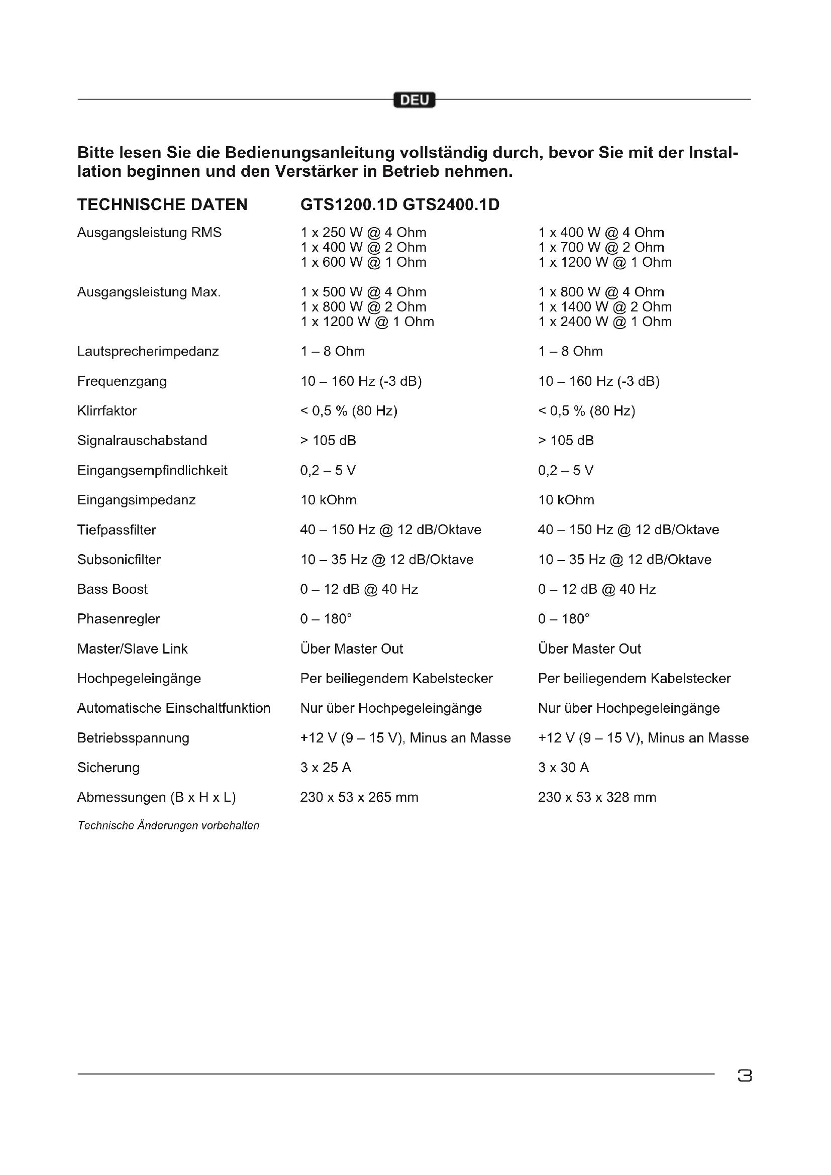 Bitte lesen Sie die Bedienungsanleitung vollständig durch, bevor Sie mit der Instal- lation beginnen und den Verstärker in Betrieb nehmen. 1 x 250 W @ 4 Ohm 1 x 400 W @ 2 Ohm 1 x 600 W @ 1 Ohm 1 x 500 W @ 4 Ohm 1 x 800 W @ 2 Ohm 1 x 1200 W @ 1 Ohm 1 – 8 Ohm 10 – 160 Hz (-3 dB) < 0,5 % (80 Hz) > 105 dB 0,2 – 5 V 10 kOhm 40 – 150 Hz @ 12 dB/Oktave 10 – 35 Hz @ 12 dB/Oktave 0 – 12 dB @ 40 Hz 0 – 180° Über Master Out Per beiliegendem Kabelstecker Nur über Hochpegeleingänge +12 V (9 – 15 V), Minus an Masse 3 x 25 A 230 x 53 x 265 mm 1 x 400 W @ 4 Ohm 1 x 700 W @ 2 Ohm 1 x 1200 W @ 1 Ohm 1 x 800 W @ 4 Ohm 1 x 1400 W @ 2 Ohm 1 x 2400 W @ 1 Ohm 1 – 8 Ohm 10 – 160 Hz (-3 dB) < 0,5 % (80 Hz) > 105 dB 0,2 – 5 V 10 kOhm 40 – 150 Hz @ 12 dB/Oktave 10 – 35 Hz @ 12 dB/Oktave 0 – 12 dB @ 40 Hz 0 – 180° Über Master Out Per beiliegendem Kabelstecker Nur über Hochpegeleingänge +12 V (9 – 15 V), Minus an Masse 3 x 30 A 230 x 53 x 328 mm TECHNISCHE DATEN Ausgangsleistung RMS Ausgangsleistung Max. Lautsprecherimpedanz Frequenzgang Klirrfaktor Signalrauschabstand Eingangsempndlichkeit Eingangsimpedanz Tiefpass lter Subsoniclter Bass Boost Phasenregler Master/Slave Link Hochpegeleingänge Automatische Einschaltfunktion Betriebsspannung Sicherung Abmessungen (B x H x L) Technische Änderungen vorbehalten