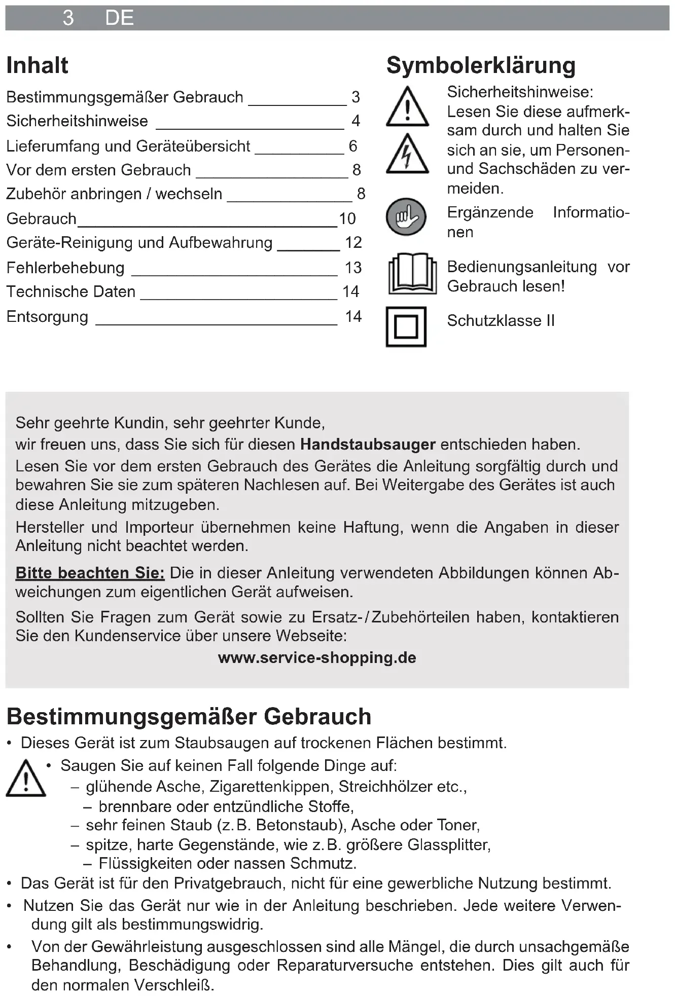 - Von der Gewährleistung ausgeschlossen sind alle Mängel, die durch unsachgemäße Behandlung, Beschädigung oder Reparaturversuche entstehen. Dies gilt auch für den normalen Verschleiß. Symbolerklärung Sicherheitshinweise: Lesen Sie diese aufmerk- sam durch und halten Sie sich an sie, um Personen- und Sachschäden zu ver- meiden. Ergänzende Informatio- nen Bedienungsanleitung vor Gebrauch lesen! Schutzklasse II Sehr geehrte Kundin, sehr geehrter Kunde, wir freuen uns, dass Sie sich für diesen Handstaubsauger entschieden haben. Lesen Sie vor dem ersten Gebrauch des Gerätes die Anleitung sorgfältig durch und bewahren Sie sie zum späteren Nachlesen auf. Bei Weitergabe des Gerätes ist auch diese Anleitung mitzugeben. Hersteller und Importeur übernehmen keine Haftung, wenn die Angaben in dieser Anleitung nicht beachtet werden. Bitte beachten Sie: Die in dieser Anleitung verwendeten Abbildungen können Ab- weichungen zum eigentlichen Gerät aufweisen. Sollten Sie Fragen zum Gerät sowie zu Ersatz- / Zubehörteilen haben, kontaktieren Sie den Kundenservice über unsere Webseite: www.service-shopping.deDE 4 Sicherheitshinweise ■ Dieses Gerät kann von Kindern ab 8 Jahren sowie von Personen mit reduzierten physischen, sensorischen oder mentalen Fähigkeiten oder Mangel an Erfahrung und/oder Wissen benutzt werden, wenn sie beaufsichtigt oder bezüglich des sicheren Gebrauchs des Gerätes unterwiesen wurden und die daraus resultierenden Gefahren verstanden haben. ■ Kinder dürfen nicht mit dem Gerät spielen. ■ Reinigung und Benutzer-Wartung dürfen nicht durch Kinder durchgeführt werden, es sei denn, sie sind älter als 8 Jahre und werden beaufsichtigt. ■ Kinder jünger als 8 Jahre und Tiere sind vom Gerät und der An- schlussleitung fernzuhalten. ■ Kinder müssen beaufsichtigt werden, um sicherzustellen, dass sie nicht mit dem Gerät spielen und / oder sich mit dem Gerät verletzen. ■ Benutzen und lagern Sie das Gerät nur außerhalb der Reichwei- te von Kindern und Tieren. Unsachgemäße Bedienung kann zu Verletzungen und Stromschlägen führen. Auch das Netzkabel darf für Kinder und Tiere nicht erreichbar sein. ■ Das Gerät ist bei nicht vorhandener Aufsicht und vor dem Zu- sammenbau, dem Auseinandernehmen oder Reinigen stets vom Netz zu trennen. ■ Laden Sie den Akku ausschließlich mit dem mitgelieferten Netz- teil auf. Laden Sie mit dem mitgelieferten Netzteil keine anderen Geräte auf. ■ Tauchen Sie das Gerät, das Netzkabel und den Stecker niemals in Wasser oder andere Flüssigkeiten ein und stellen Sie sicher, dass diese nicht in Wasser fallen oder nass werden können. ■ Wenn das Gerät, die Anschlussleitung oder der Stecker des Ge- rätes beschädigt ist, muss es durch den Hersteller oder Kunden- service oder eine ähnlich qualifi zierte Person (z. B. Fachwerk- statt) ersetzt werden, um Gefährdungen zu vermeiden. Verletzungsgefahren ■ Halten Sie Kinder und Tiere vom Gerät und Verpackungsmaterial fern. Es besteht Verletzungs- und Erstickungsgefahr!5 DE ■ Benutzen Sie das Gerät nicht, wenn es beschädigt ist. ■ Halten Sie die Düsen während des Gebrauchs niemals in die Nähe von Körperteilen oder Tieren. Sie könnten sich festsaugen. Sollte sich der Staubsauger doch einmal festsaugen, schalten Sie das Gerät sofort mit dem Ein- / Ausschalter aus. ■ Verlegen Sie das Kabel so, dass es keine Stolpergefahr darstellt. Stromschlag- und Brandgefahr ■ Schließen Sie das Gerät nur an eine vorschriftsmäßig installierte Steckdose mit Schutzkontakten an. Die Steckdose muss auch nach dem Anschließen gut zugäng- lich sein, damit die Netzverbindung schnell getrennt werden kann. Die Netzspan- nung muss mit den technischen Daten des Gerätes übereinstimmen. Verwenden Sie nur ordnungsgemäße Verlängerungskabel, deren technische Daten mit denen des Gerätes übereinstimmen. ■ Sollte das Gerät ins Wasser fallen, unterbrechen Sie sofort die Stromzufuhr. Versu- chen Sie nicht, das Gerät aus dem Wasser zu ziehen, während es am Stromnetz angeschlossen ist! ■ Berühren Sie das Gerät, das Netzkabel und den Netzstecker niemals mit feuchten Händen, wenn diese Komponenten an das Stromnetz angeschlossen sind. ■ Schalten Sie das Gerät aus und ziehen Sie den Stecker aus der Steckdose, – wenn Sie Ihre Arbeit mit dem Gerät unterbrechen, – vor einem Gewitter, – wenn während des Betriebes ein Fehler oder eine Störung auftritt, – wenn Fremdkörper in das Gerät gelangt sind. ■ Ziehen Sie immer am Stecker und nie am Netzkabel. ■ Verwenden Sie das Gerät nur in geschlossenen Räumen. ■ Verwenden Sie das Gerät nicht in Räumen, in denen sich leichtentzündlicher Staub oder giftige sowie explosive Dämpfe befi nden. ■ Brandgefahr! Betreiben Sie das Gerät nicht in einer sehr feuchten Umgebung oder in der Nähe von brennbarem Material. Vermeiden von Material-, Sach- und Geräteschäden ■ Achten Sie darauf, dass das Netzkabel nicht gequetscht, geknickt oder über scharfe Kanten gelegt wird und nicht mit heißen Flächen in Berührung kommt. ■ Halten Sie ausreichend Abstand zu Wärmequellen wie Herdplatten oder Öfen, um Geräteschäden zu vermeiden. Stellen Sie kein offenes Feuer, z. B. brennende Ker- zen, in die direkte Nähe des Gerätes, Kabels, Akkus und Netzteils. ■ Lassen Sie das Gerät nicht fallen und setzen Sie es keinen starken Stößen aus. ■ Ziehen oder tragen Sie das Gerät nicht am Kabel des Netzteils. ■ Setzen Sie das Gerät keinen extremen Temperaturen, starken Temperaturschwan- kungen, Feuchtigkeit, Nässe oder direkter Sonneneinstrahlung aus. ■ Verwenden Sie zum Reinigen des Gerätes keine ätzenden oder scheuernden Reini- gungsmittel. Diese können die Oberfl äche beschädigen. ■ Benutzen Sie das Gerät nur, wenn es vollständig und korrekt zusammengebaut ist! Der Staubbehälter und die Filter müssen eingesetzt sein. Die Filter dürfen nicht be- schädigt sein!DE 6 ■ Stecken Sie nichts in die Öffnungen / D