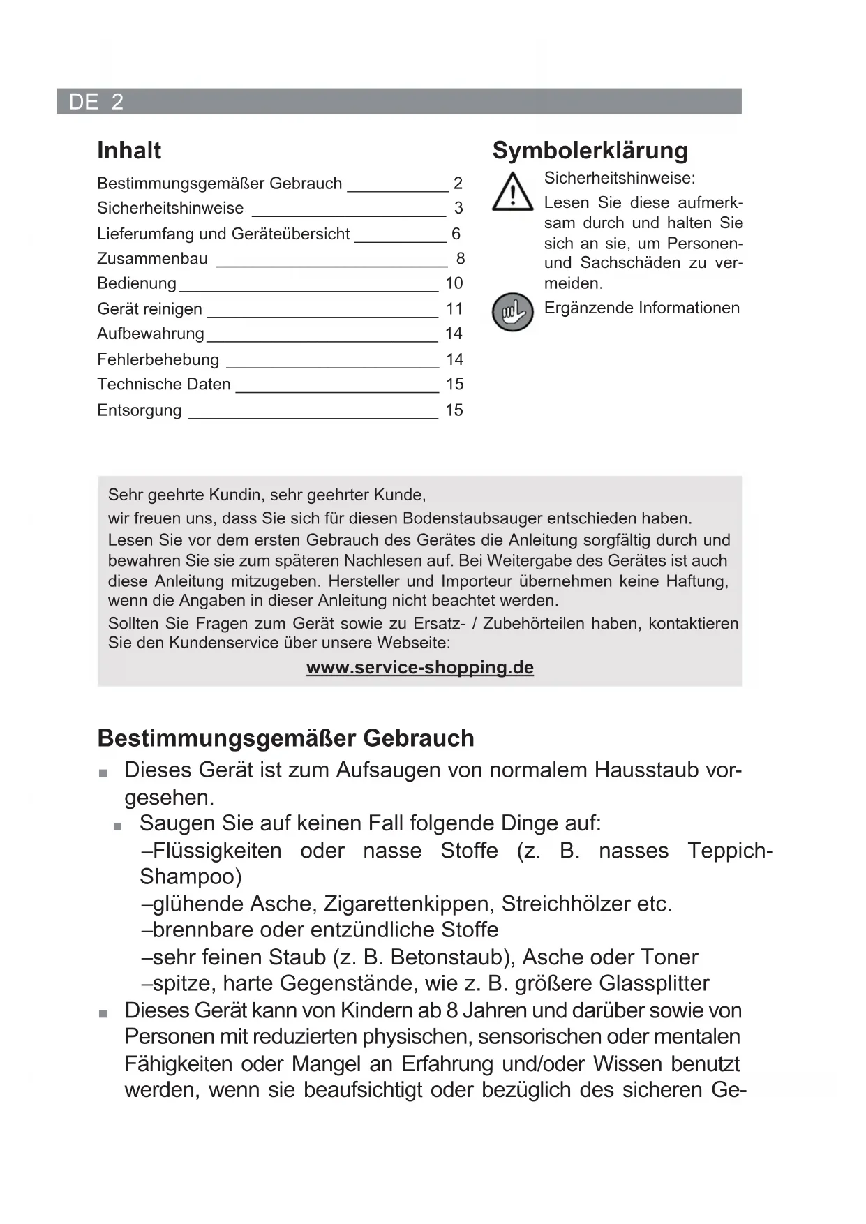 Handleiding vanaf pagina 43DE 2 Sehr geehrte Kundin, sehr geehrter Kunde, wir freuen uns, dass Sie sich für diesen Bodenstaubsauger entschieden haben. Lesen Sie vor dem ersten Gebrauch des Gerätes die Anleitung sorgfältig durch und bewahren Sie sie zum späteren Nachlesen auf. Bei Weitergabe des Gerätes ist auch diese Anleitung mitzugeben. Hersteller und Importeur übernehmen keine Haftung, wenn die Angaben in dieser Anleitung nicht beachtet werden. Sollten Sie Fragen zum Gerät sowie zu Ersatz- / Zubehörteilen haben, kontaktieren Sie den Kundenservice über unsere Webseite: www.service-shopping.de Bestimmungsgemäßer Gebrauch ■ Dieses Gerät ist zum Aufsaugen von normalem Hausstaub vor- gesehen. ■ Saugen Sie auf keinen Fall folgende Dinge auf: – Flüssigkeiten oder nasse Stoffe (z. B. nasses Teppich- Shampoo) – glühende Asche, Zigarettenkippen, Streichhölzer etc. – brennbare oder entzündliche Stoffe – sehr feinen Staub (z. B. Betonstaub), Asche oder Toner – spitze, harte Gegenstände, wie z. B. größere Glassplitter ■ Dieses Gerät kann von Kindern ab 8 Jahren und darüber sowie von Personen mit reduzierten physischen, sensorischen oder mentalen Fähigkeiten oder Mangel an Erfahrung und/oder Wissen benutzt werden, wenn sie beaufsichtigt oder bezüglich des sicheren Ge- Inhalt Bestimmungsgemäßer Gebrauch ___________ 2 Sicherheitshinweise _____________________ 3 Lieferumfang und Geräteübersicht __________ 6 Zusammenbau _________________________ 8 Bedienung ____________________________ 10 Gerät reinigen _________________________ 11 Aufbewahrung _________________________ 14 Fehlerbehebung _______________________ 14 Technische Daten ______________________ 15 Entsorgung ___________________________ 15 Symbolerklärung Sicherheitshinweise: Lesen Sie diese aufmerk- sam durch und halten Sie sich an sie, um Personen- und Sachschäden zu ver- meiden. Ergänzende Informationen3 DE brauchs des Gerätes unterwiesen wurden und die daraus resultie- renden Gefahren verstanden haben. Kinder dürfen nicht mit dem Gerät spielen. Reinigung und Benutzer-Wartung dürfen nicht von Kindern ohne Beaufsichtigung durchgeführt werden. ■ Das Gerät ist für den Privatgebrauch, nicht für eine gewerbliche Nutzung bestimmt. ■ Nutzen Sie das Gerät nur wie in der Anleitung beschrieben. Jede weitere Verwendung gilt als bestimmungswidrig. ■ Von der Gewährleistung ausgeschlossen sind alle Mängel, die durch unsachgemäße Behandlung, Beschädigung oder Repa- raturversuche entstehen. Dies gilt auch für den normalen Ver- schleiß. Sicherheitshinweise Verletzungsgefahren ■ Erstickungsgefahr! Halten Sie das Verpackungsmaterial von Kin- dern und Tieren fern. ■ Halten Sie das Gerät, das Kabel und den Stecker von Wasser oder anderen Flüssigkeiten fern, um Stromschläge zu vermei- den. Fassen Sie den Netzstecker, das Kabel oder Gerät nie mit nassen bzw. feuchten Händen an. ■ Halten Sie Tiere, Haare, Schmuck, weite Kleidung, Finger und alle übrigen Körperteile von den Düsen des Gerätes fern. Sie könnten sich festsaugen. Sollte sich der Staubsauger doch ein- mal festsaugen, schalten Sie das Gerät sofort aus. ■ Seien Sie bei der Reinigung von Stufen besonders vorsichtig, da- mit Sie nicht stürzen. ■ Tragen Sie beim Gebrauch festes Schuhwerk. ■ Benutzen und lagern Sie das Gerät nur außerhalb der Reich- weite von Kindern. Unsachgemäße Bedienung kann zu Verlet- zungen und Stromschlägen führen. Auch das Netzkabel darf für Kinder nicht erreichbar sein.DE 4 Das richtige Anschließen ■ Schließen Sie das Gerät nur an eine vorschriftsmäßig instal- lierte Steckdose an. Die Steckdose muss auch nach dem An- schließen gut zugänglich sein. Die Netzspannung muss mit den technischen Daten des Gerätes übereinstimmen (siehe Kapitel „Technische Daten“). Verwenden Sie nur ordnungsgemäße Ver- längerungskabel, deren technische Daten mit denen des Gerä- tes übereinstimmen. ■ Achten Sie darauf, dass das angeschlossene Netzkabel keine Stolpergefahr darstellt, nicht gequetscht oder geknickt wird und nicht mit heißen Flächen in Berührung kommt. Der richtige Gebrauch ■ Verwenden und lagern Sie das Gerät nur in geschlossenen Räu- men. Betreiben Sie es nicht im Freien, in Räumen mit hoher Luft- feuchtigkeit oder auf heißen Oberfl ächen. ■ Überprüfen Sie das Gerät und das Zubehör vor jeder Inbetrieb- nahme auf Beschädigungen. Wenn das Gerät, das Kabel, der Stecker, das Zubehör oder ein Filter sichtbare Schäden aufwei- sen, darf das Gerät nicht benutzt werden. Versuchen Sie nicht, das Gerät eigenständig zu reparieren oder Teile zu ersetzen. Kontaktieren Sie in Schadensfällen den Kundenservice. ■ Verwenden Sie das Gerät nicht, wenn es eine Fehlfunktion hatte, Flüssigkeiten oder Gegenstände aufgesogen wurden, die nicht mit dem bestimmungsgemäßen Gebrauch des Gerätes verein- bar sind (siehe Kapitel „Bestimmungsgemäßer Gebrauch“), oder das Gerät heruntergefallen ist. Lassen Sie das Gerät von einem Fachmann prüfen. ■ Benutzen Sie das Gerät nur, wenn es vollständig und korrekt zusammengebaut ist! Die Filter und der Staubgehälter müssen eingesetzt und unbeschädigt sein! Damit der Staubbehälter rich- tig eingesetzt werden kann, muss er verschlossen sein. ■ Setzen Sie das Gerät keinen extremen Temperaturen, starken Temperaturschwankungen, offenem Feuer, direkter Sonnenein- strahlung, Feuchtigkeit oder Nässe aus.5 DE ■ Lassen Sie das Gerät nicht fallen und setzen Sie es keinen star- ken Stößen aus. ■ Stellen Sie niemals schwere Gegenstände auf das Gerät. ■ Tauchen Sie das Gerät nicht in Wasser oder andere Flüssigkei- ten, um Stromschläge zu vermeiden. Füllen Sie keine Flüssig- keiten in den Staubbehälter. ■ Berühren Sie das Gerät, das Kabel oder den Stecker niemals mit feuchten Händen. ■ Stecken Sie nichts in die Öffnungen / Düsen des Gerätes und achten Sie darauf, dass diese nicht verstopft sind. ■ Lass
