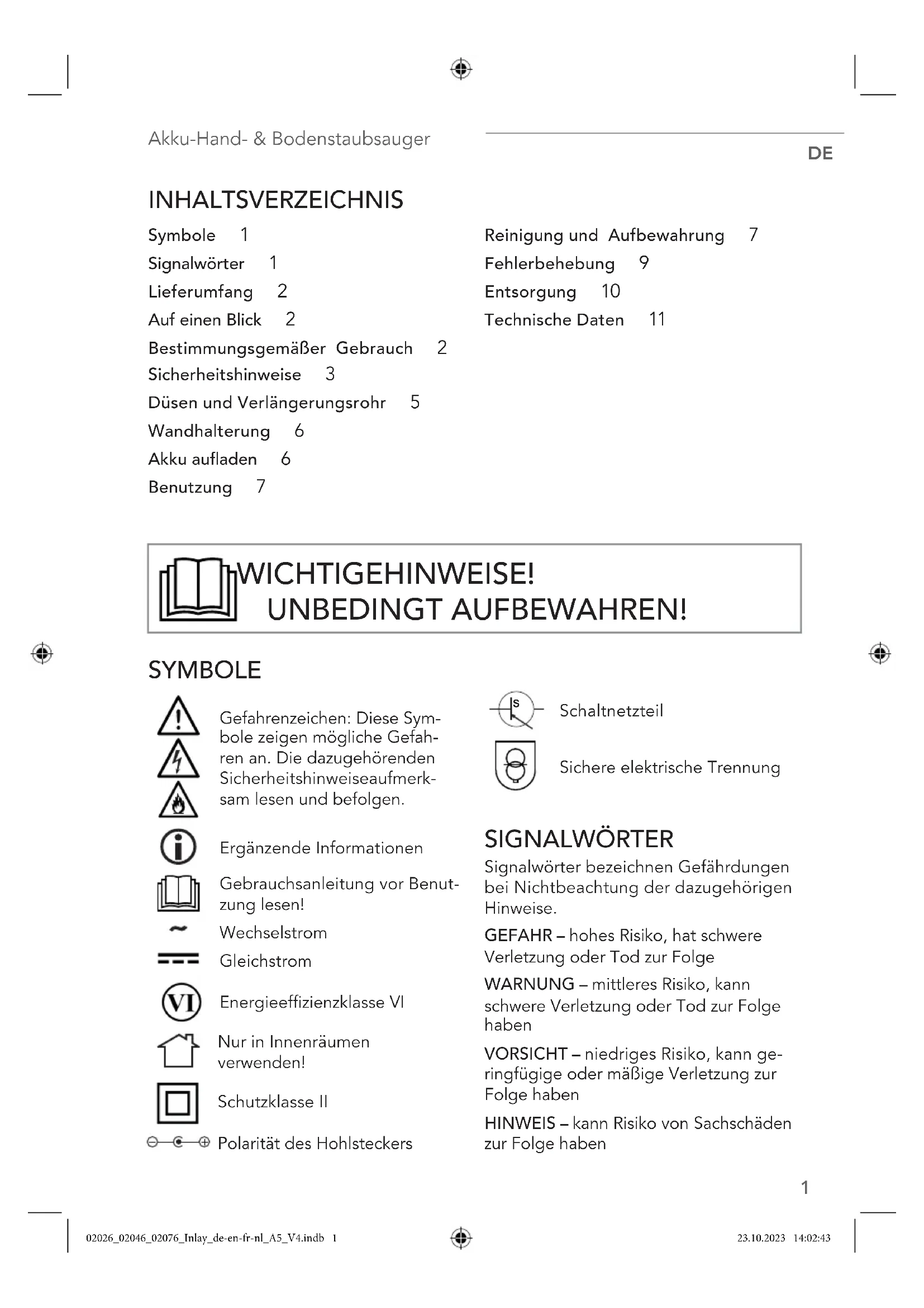 (Bild B) 9 Anzeige Saugstufe 1 10 Anzeige Saugstufe 2 11 Ein- / Aus-Taste (2 Saugstufen) 12 Handgriff 13 Ladekontrollleuchten 14 Ladebuchse 15 Akku (im Gehäuse) 16 Staubbehälterklappe 17 Metallfilter 18 HEPA13-Filter 19 Taste zum Öffnen der Staubbehälter- klappe 20 Staubbehälter 21 Saugöffnung 22 Abluftfilterfach 23 Filterfachabdeckung 24 Entriegelungstaste der Filterfachab- deckung BESTIMMUNGSGEMÄßER GEBRAUCH ■ Dieses Gerät ist zum Aufsaugen von herkömmlichem Hausstaub vorgese- hen. Auf keinen Fall folgende Dinge aufsaugen: ○ Flüssigkeiten oder nasse Stoffe (z. B. nasses Teppich- Shampoo) ○ glühende Asche, Zigaretten- kippen, Streichhölzer etc. ○ brennbare oder entzündliche Stoffe ○ sehr feinen Staub (z. B. Beton- staub), Asche oder Toner ○ spitze, harte Gegenstände, z. B. größere Glassplitter ■ Das Gerät ist für den privaten Ge- brauch, nicht für eine gewerbliche Nutzung bestimmt. ■ Das Gerät nur wie in der Gebrauchs- anleitung beschrieben nutzen. Jede weitere Verwendung gilt als bestim- mungswidrig. ■ Von der Gewährleistung ausge- schlossen sind alle Mängel, die durch unsachgemäße Behandlung, Beschädigung oder Reparaturversu- che entstehen. Dies gilt auch für den normalen Verschleiß. 02026_02046_02076_Inlay_de-en-fr-nl_A5_V4.indb 202026_02046_02076_Inlay_de-en-fr-nl_A5_V4.indb 2 23.10.2023 14:02:4323.10.2023 14:02:43Akku-Hand- & Bodenstaubsauger