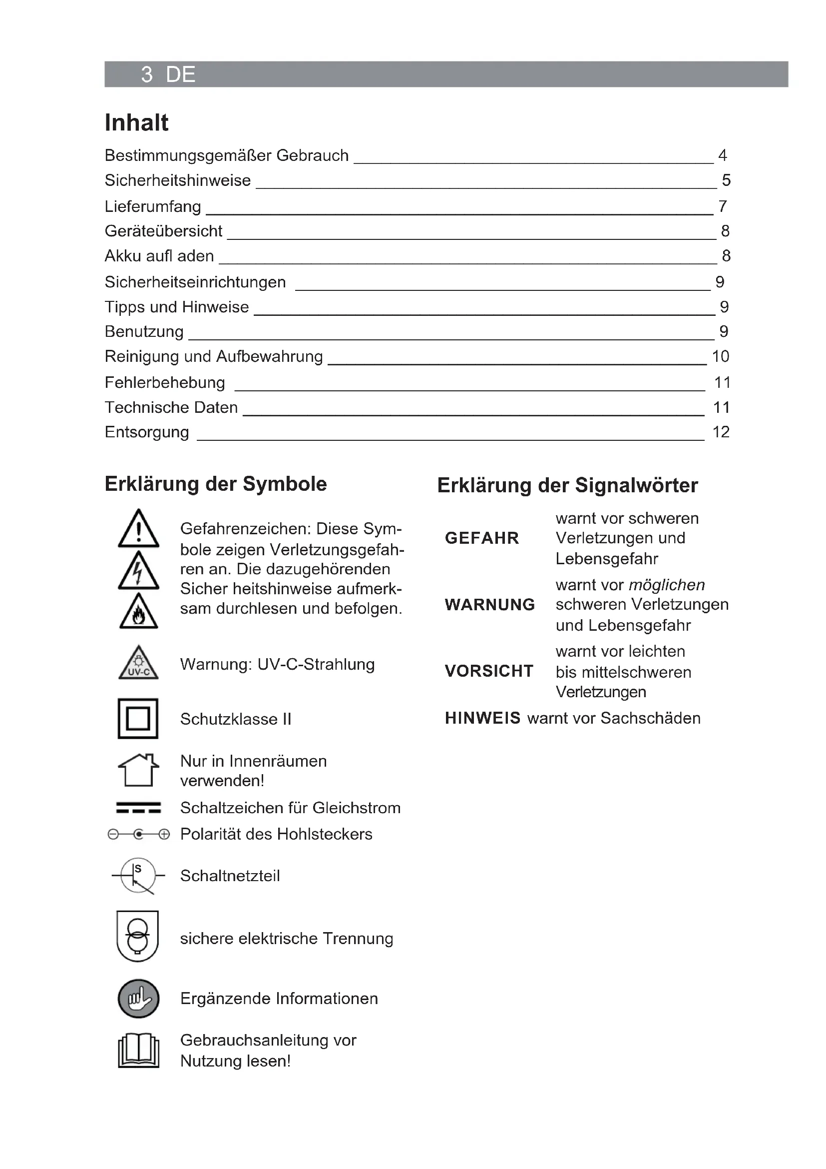 Gebruiksaanwijzing vanaf pagina 323 DE Erklärung der Symbole Gefahrenzeichen: Diese Sym- bole zeigen Verletzungsgefah- ren an. Die dazugehörenden Sicher heitshinweise aufmerk- sam durchlesen und befolgen. Warnung: UV-C-Strahlung Schutzklasse II Nur in Innenräumen verwenden! Schaltzeichen für Gleichstrom Polarität des Hohlsteckers