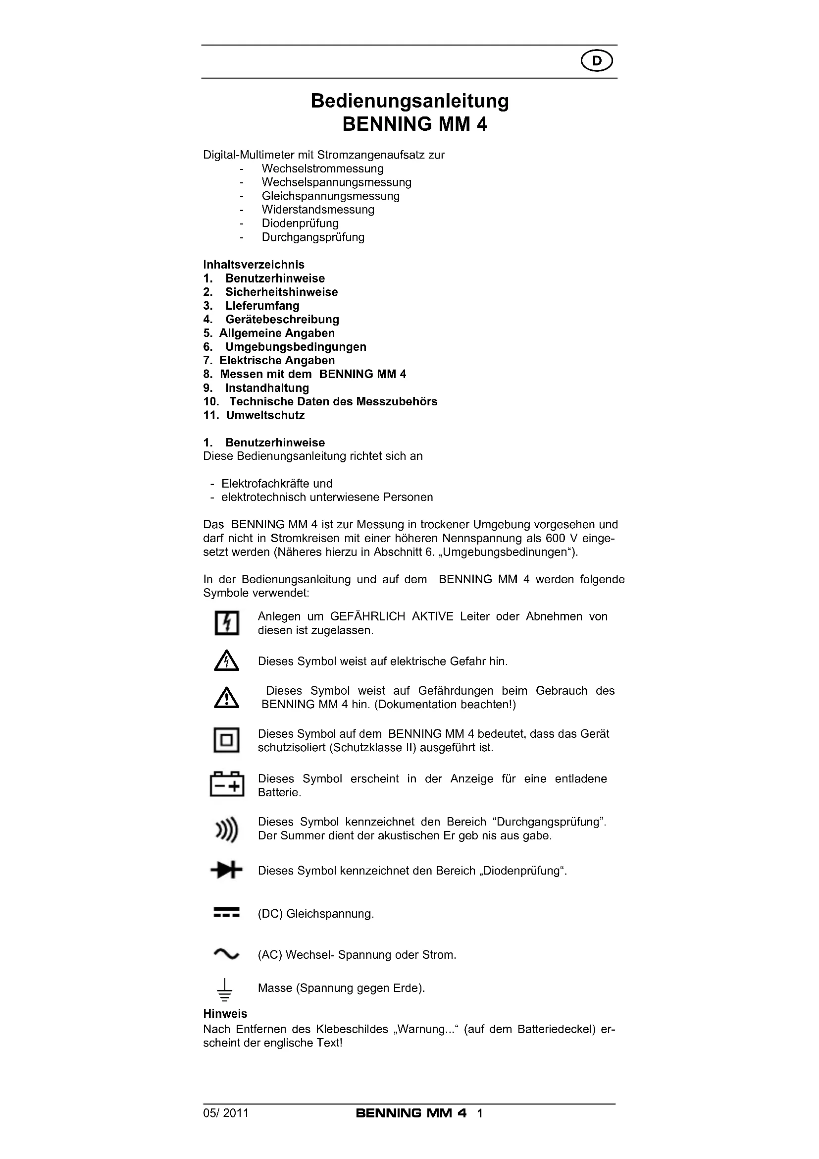 Finden Sie kostenlos die Bedienungsanleitung des Geräts MM 4 BENNING als PDF.