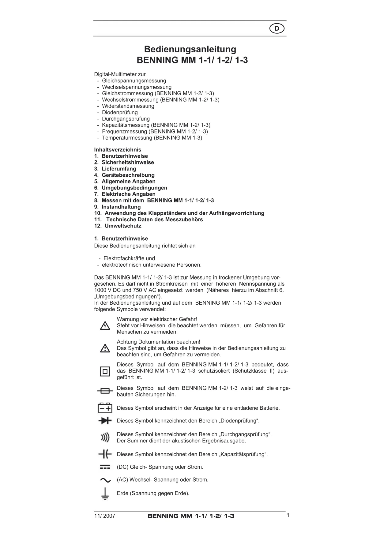 Diese Bedienungsanleitung richtet sich an - Elektrofachkräfte und - elektrotechnisch unterwiesene Personen. Das BENNING MM 1-1/ 1-2/ 1-3 ist zur Messung in trockener Umgebung vor- gesehen. Es darf nicht in Stromkreisen mit einer höheren Nennspannung als 1000 V DC und 750 V AC eingesetzt werden (Näheres hierzu im Abschnitt 6. „Umgebungsbedingungen“). In der Bedienungsanleitung und auf dem BENNING MM 1-1/ 1-2/ 1-3 werden folgende Symbole verwendet: