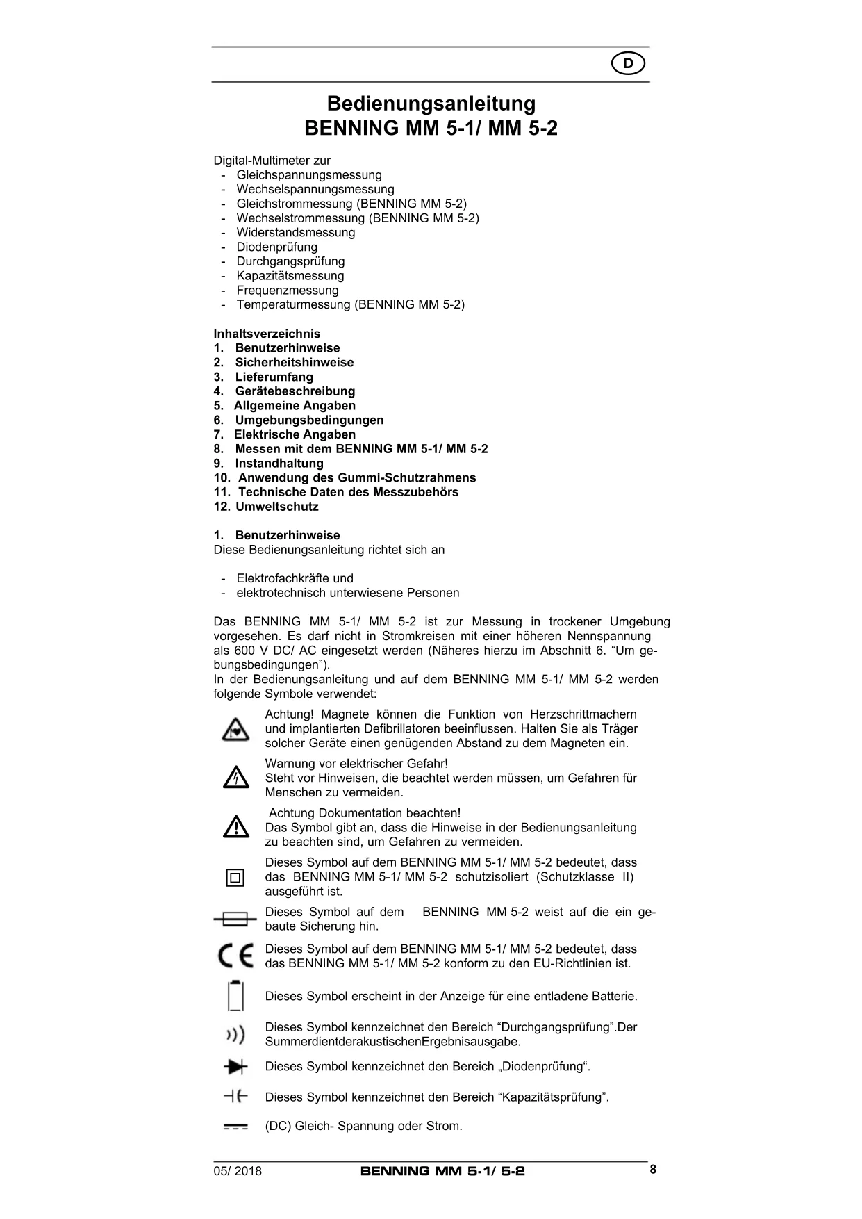 Das BENNING MM 5-1/ MM 5-2 ist zur Messung in trockener Umgebung vorgesehen. Esarf nicht in Stromkreisen mit einer hoheren Nennspannung als 600V DC/ AC eingesetzt werden (Naheres hierzu im Abschnitt 6. "Um gebungsbedingungen").