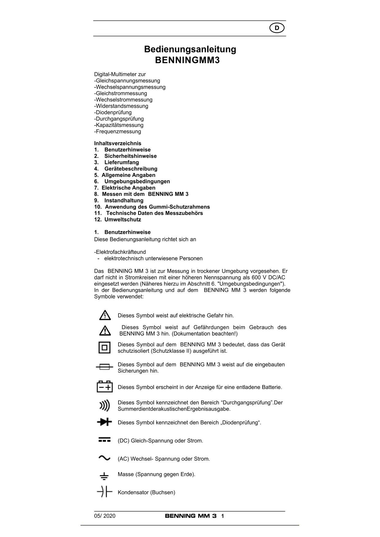Bedienungsanleitung BENNING MM 3 Digital-Multimeter zur - Gleichspannungsmessung - Wechselspannungsmessung - Gleichstrommessung - Wechselstrommessung - Widerstandsmessung - Diodenprüfung - Durchgangsprüfung - Kapazitätsmessung - Frequenzmessung Inhaltsverzeichnis