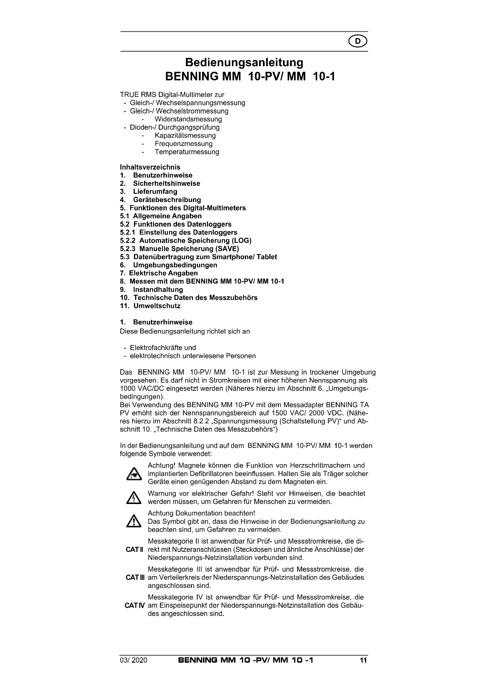 Finden Sie kostenlos die Bedienungsanleitung des Geräts MM 10PV BENNING als PDF.