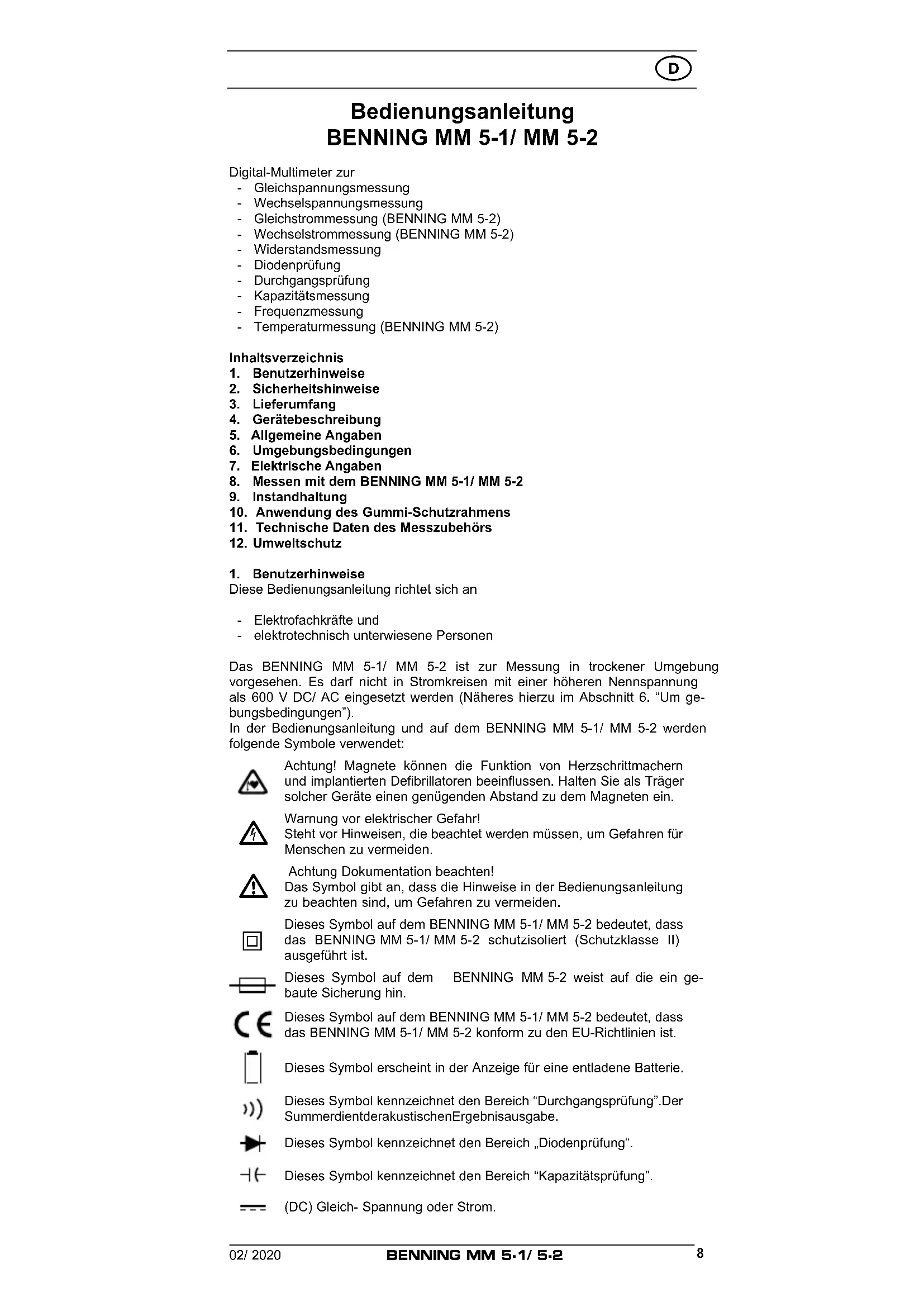 - Das BENNING MM 5-1/ MM 5-2 ist für Messungen in trockener Umgebung vorgesehen, - Barometrische Höhe bei Messungen: Maximal 2000 m,02/ 2020