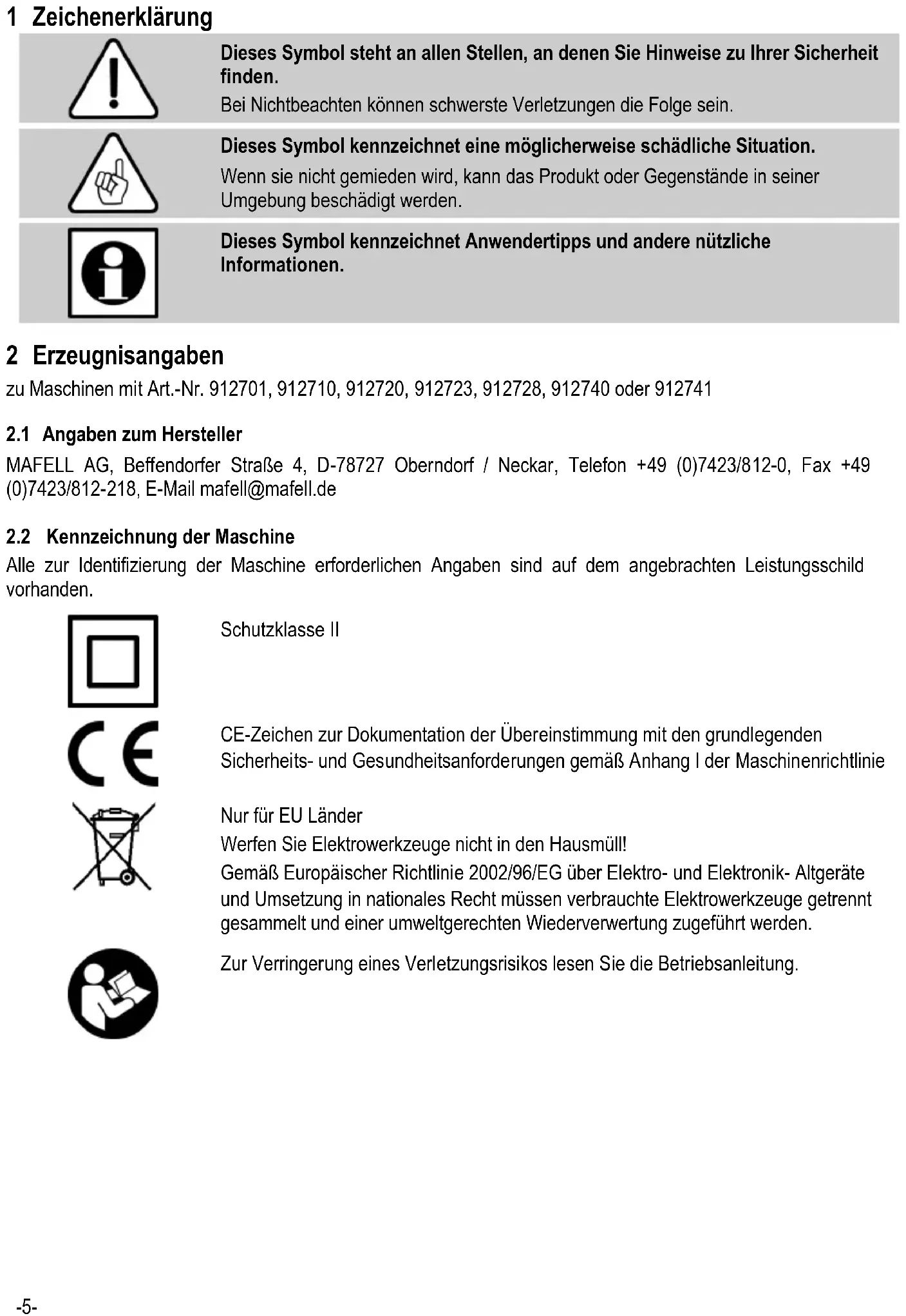 Dieses Symbol kennzeichnet Anwendertipps und andere nützliche Informationen. 2 Erzeugnisangaben zu Maschinen mit Art.-Nr. 912701, 912710, 912720, 912723, 912728, 912740 oder 912741