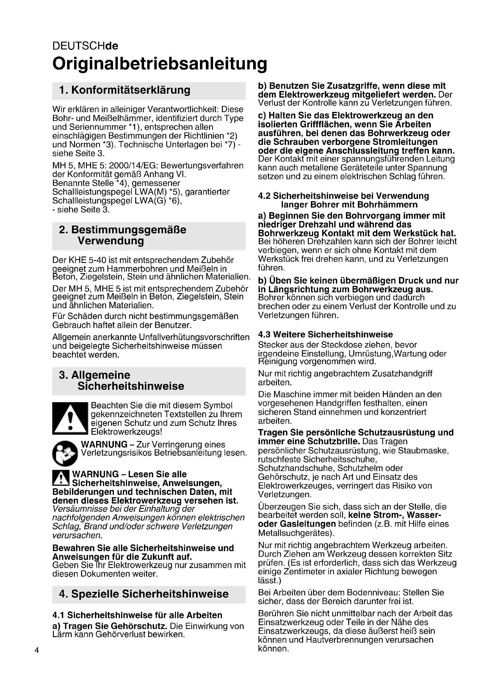 MH 5, MHE 5:2000/14/EG:Bewertungsverfahren der Konformität gemäß Anhang VI. Benannte Stelle *4), gemessener Schalleistungspegel LWA(M) *5), guarantorier Schalleistungspegel LWA(G) *6), - siehe Seite 3.