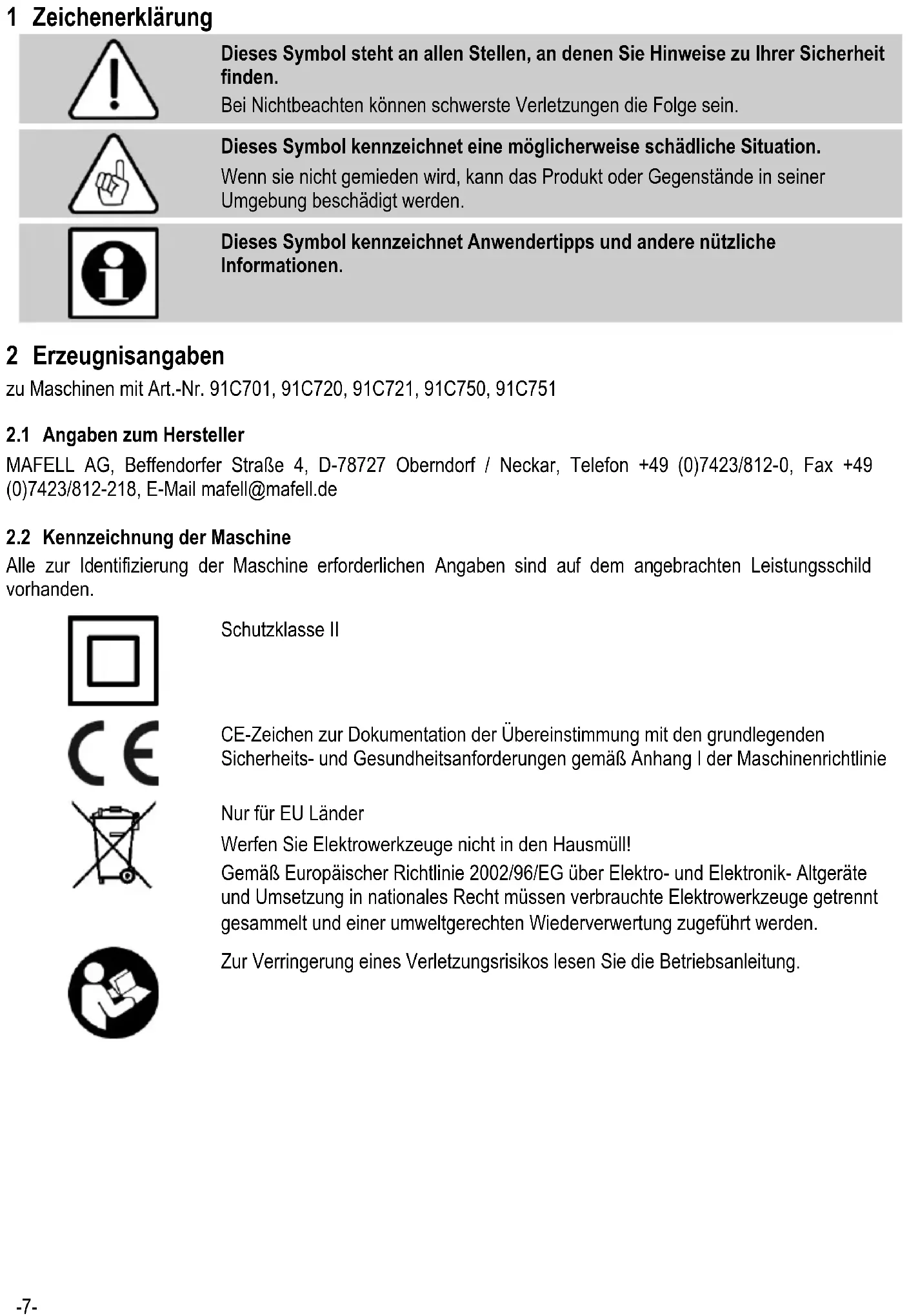 2 Erzeugnisangaben zu Maschinen mit Art.-Nr. 91C701, 91C720, 91C721, 91C750, 91C751