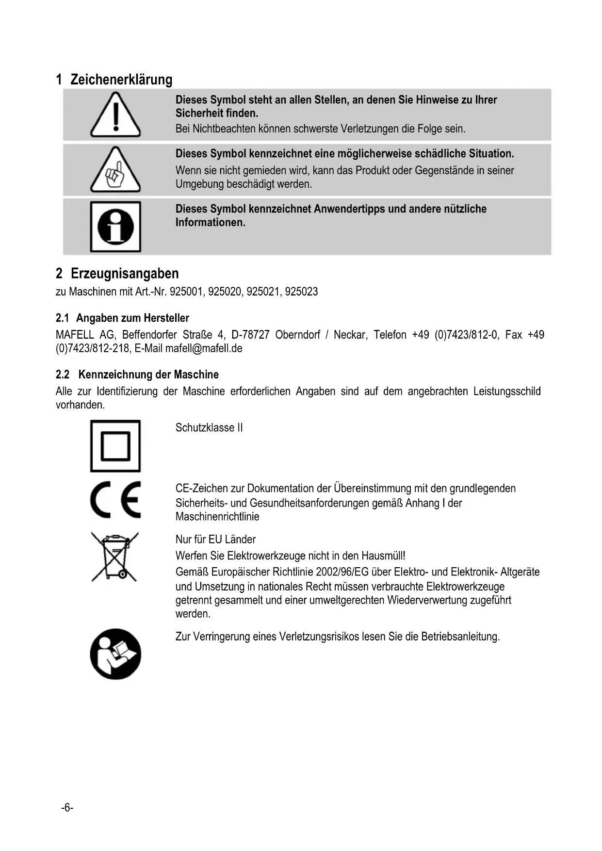 Dieses Symbol kennzeichnet Anwendertipps und andere nützliche Informationen. 2 Erzeugnisangaben zu Maschinen mit Art.-Nr. 925001, 925020, 925021, 925023