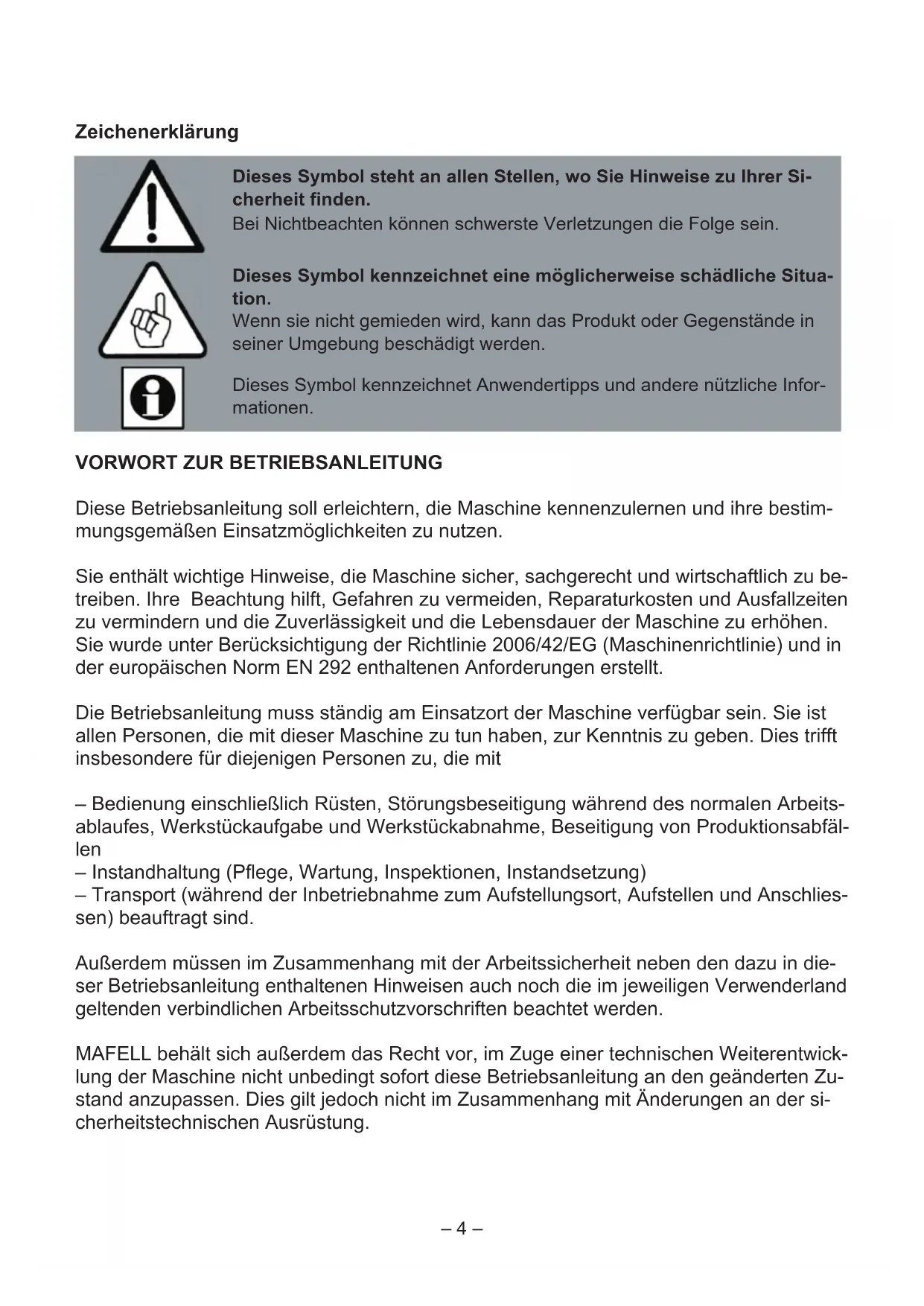 Diese Betriebsanleitung soll erleichtern, die Maschine kennenzulernen und ihre bestim- mungsgemäßen Einsatzmöglichkeiten zu nutzen. Sie enthält wichtige Hinweise, die Maschine sicher, sachgerecht und wirtschaftlich zu be- treiben. Ihre Beachtung hilft, Gefahren zu vermeiden, Reparaturkosten und Ausfallzeiten zu vermindern und die Zuverlässigkeit und die Lebensdauer der Maschine zu erhöhen. Sie wurde unter Berücksichtigung der Richtlinie 2006/42/EG (Maschinenrichtlinie) und in der europäischen Norm EN 292 enthaltenen Anforderungen erstellt. Die Betriebsanleitung muss ständig am Einsatzort der Maschine verfügbar sein. Sie ist allen Personen, die mit dieser Maschine zu tun haben, zur Kenntnis zu geben. Dies trifft insbesondere für diejenigen Personen zu, die mit – Bedienung einschließlich Rüsten, Störungsbeseitigung während des normalen Arbeits- ablaufes, Werkstückaufgabe und Werkstückabnahme, Beseitigung von Produktionsabfäl- len – Instandhaltung (Pflege, Wartung, Inspektionen, Instandsetzung) – Transport (während der Inbetriebnahme zum Aufstellungsort, Aufstellen und Anschlies- sen) beauftragt sind. Außerdem müssen im Zusammenhang mit der Arbeitssicherheit neben den dazu in die- ser Betriebsanleitung enthaltenen Hinweisen auch noch die im jeweiligen Verwenderland geltenden verbindlichen Arbeitsschutzvorschriften beachtet werden. MAFELL behält sich außerdem das Recht vor, im Zuge einer technischen Weiterentwick- lung der Maschine nicht unbedingt sofort diese Betriebsanleitung an den geänderten Zu- stand anzupassen. Dies gilt jedoch nicht im Zusammenhang mit Änderungen an der si- cherheitstechnischen Ausrüstung. Dieses Symbol steht an allen Stellen, wo Sie Hinweise zu Ihrer Si- cherheit finden. Bei Nichtbeachten können schwerste Verletzungen die Folge sein. Dieses Symbol kennzeichnet eine möglicherweise schädliche Situa- tion. Wenn sie nicht gemieden wird, kann das Produkt oder Gegenstände in seiner Umgebung beschädigt werden. Dieses Symbol kennzeichnet Anwendertipps und andere nützliche Infor- mationen.– 5– 1 Erzeugnisangaben zur Maschine mit Art.-Nr. 991201