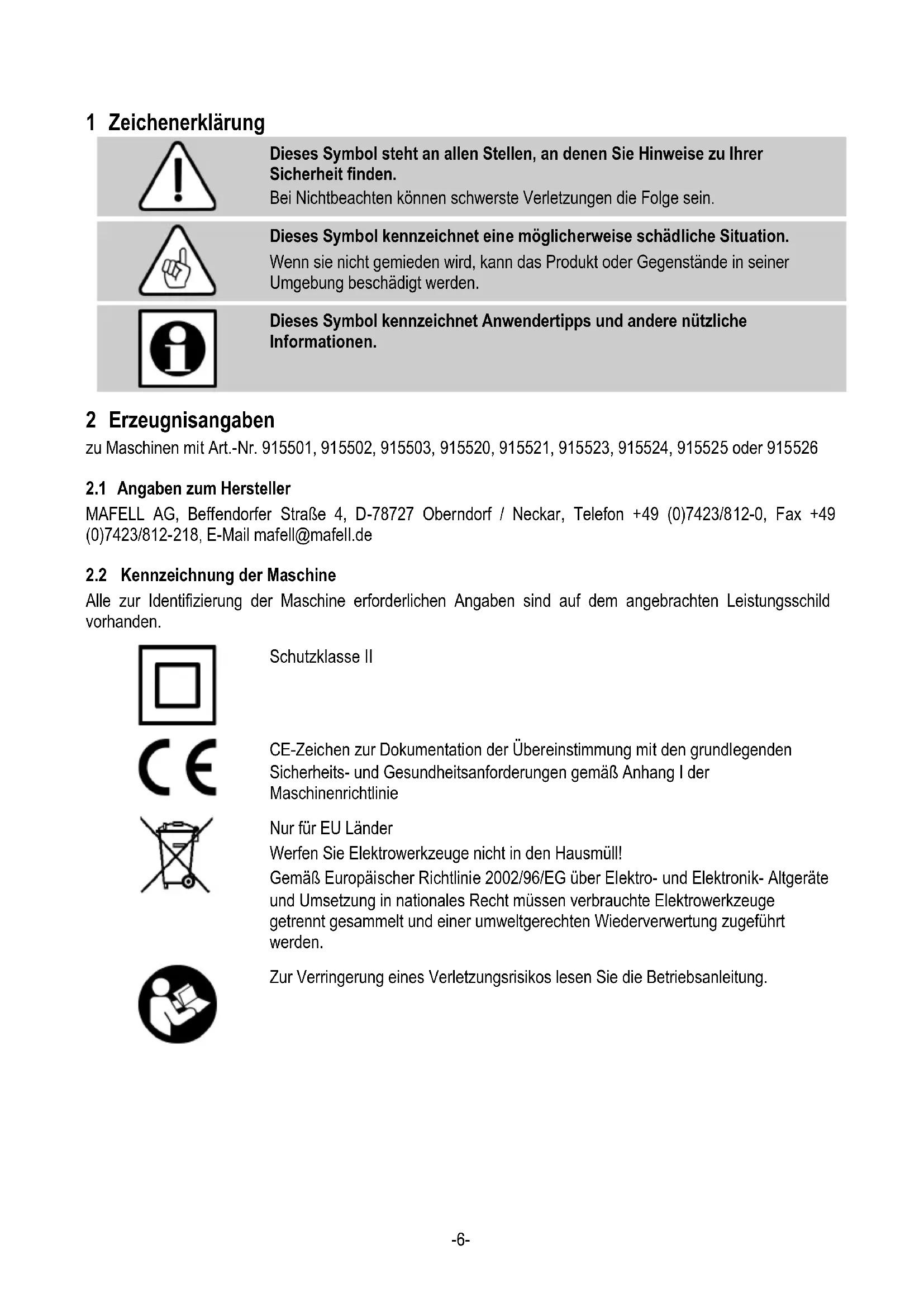 Dieses Symbol kennzeichnet Anwendertipps und andere nützliche Informationen. 2 Erzeugnisangaben zu Maschinen mit Art.-Nr. 915501, 915502, 915503, 915520, 915521, 915523, 915524, 915525 oder 915526