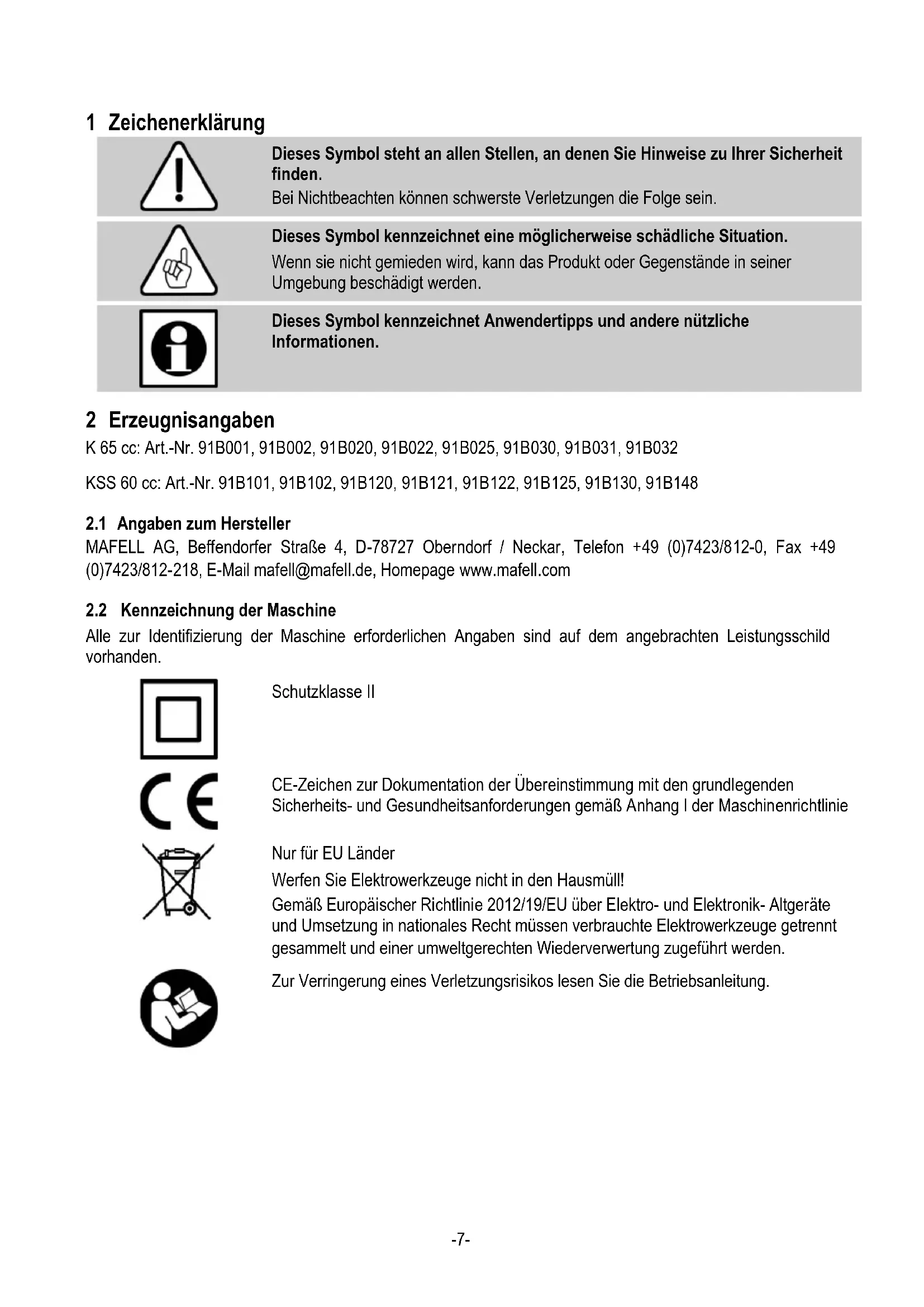 Dieses Symbol kennzeichnet Anwendertipps und andere nützliche Informationen. 2 Erzeugnisangaben K 65 cc: Art.-Nr. 91B001, 91B002, 91B020, 91B022, 91B025, 91B030, 91B031, 91B032 KSS 60 cc: Art.-Nr. 91B101, 91B102, 91B120, 91B121, 91B122, 91B125, 91B130, 91B148
