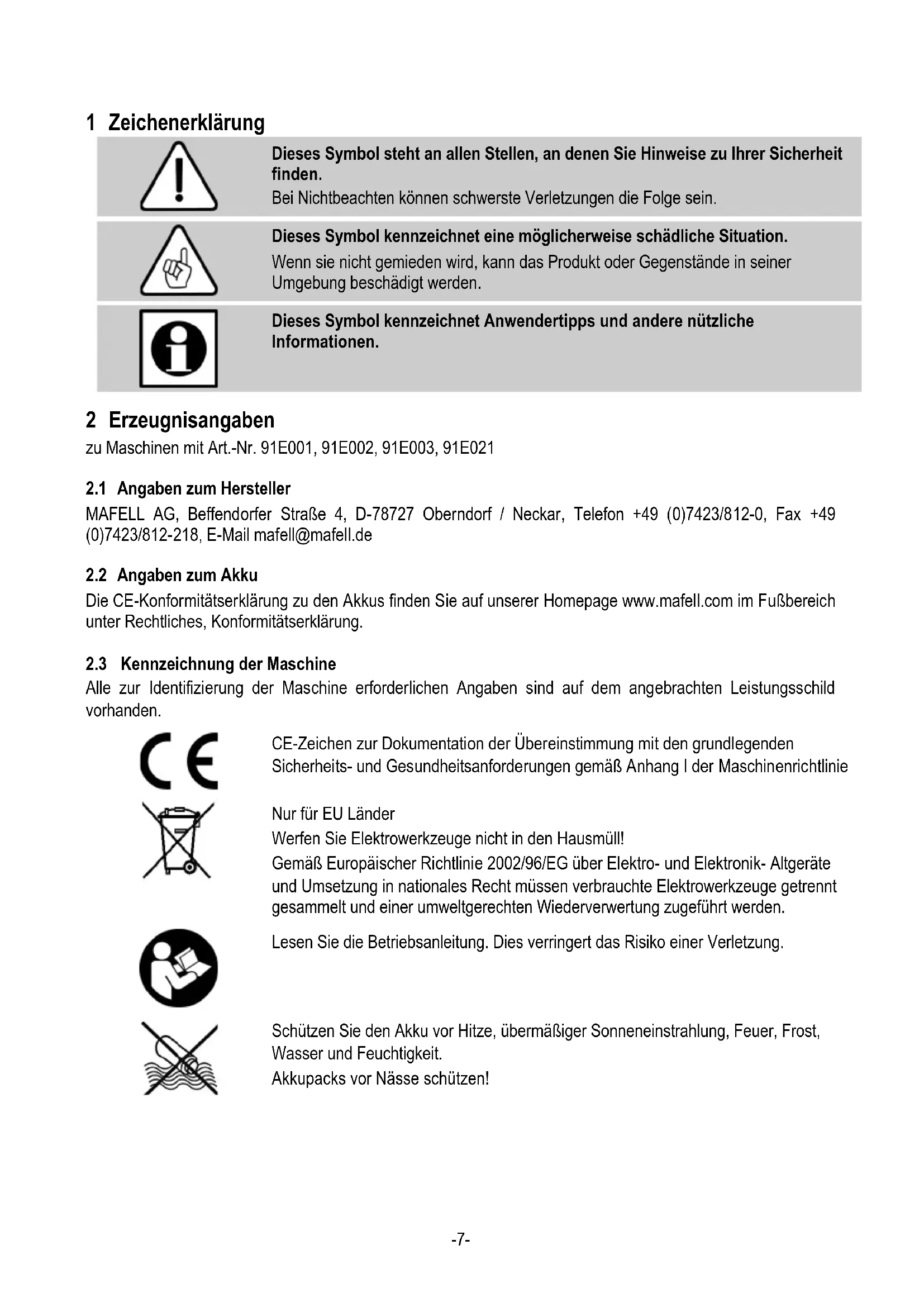 Dieses Symbol kennzeichnet Anwendertipps und andere nützliche Informationen. 2 Erzeugnisangaben zu Maschinen mit Art.-Nr. 91E001, 91E002, 91E003, 91E021