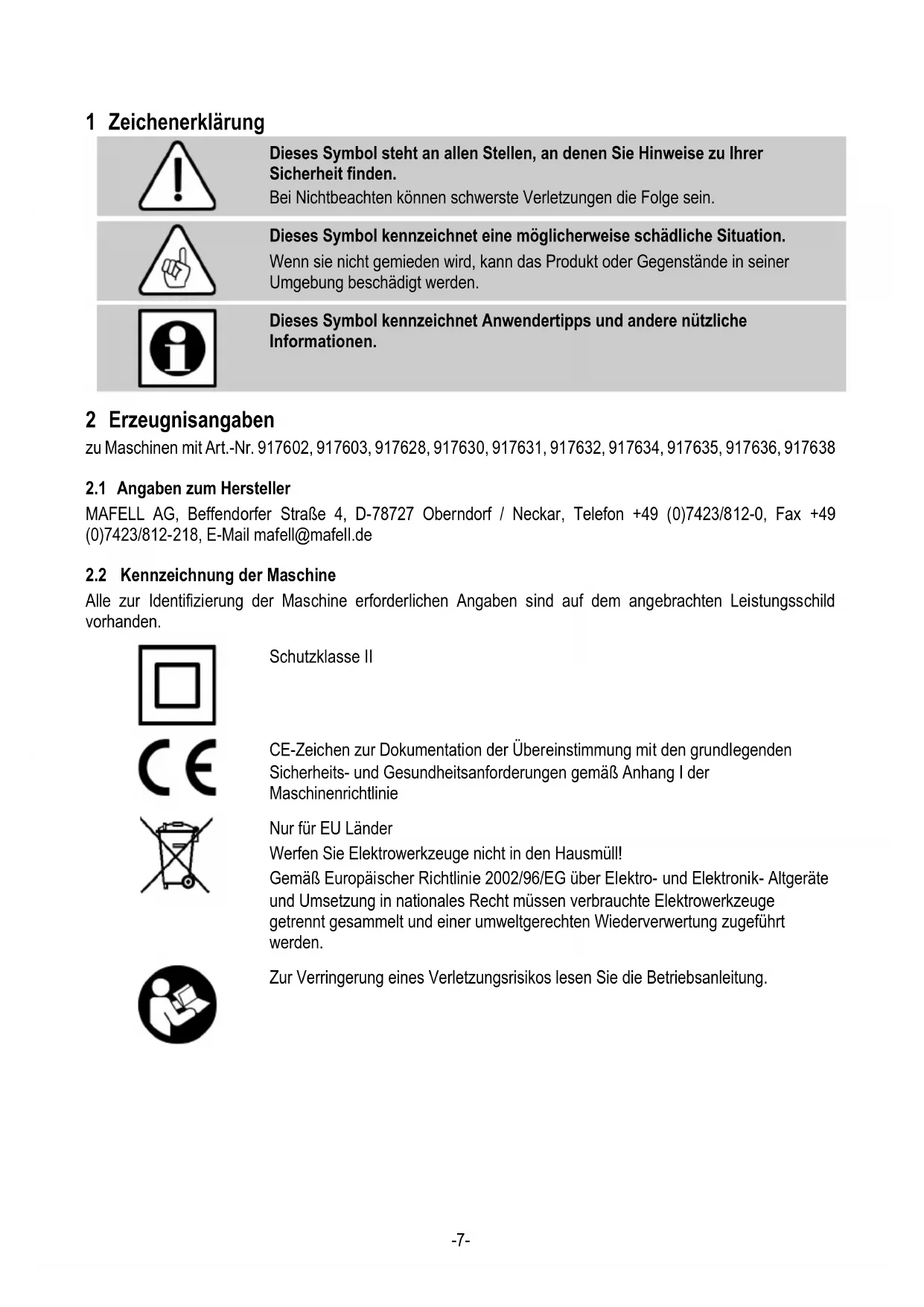 Dieses Symbol kennzeichnet Anwendertipps und andere nützliche Informationen. 2 Erzeugnisangaben zu Maschinen mit Art.-Nr. 917602, 917603, 917628, 917630, 917631, 917632, 917634, 917635, 917636, 917638