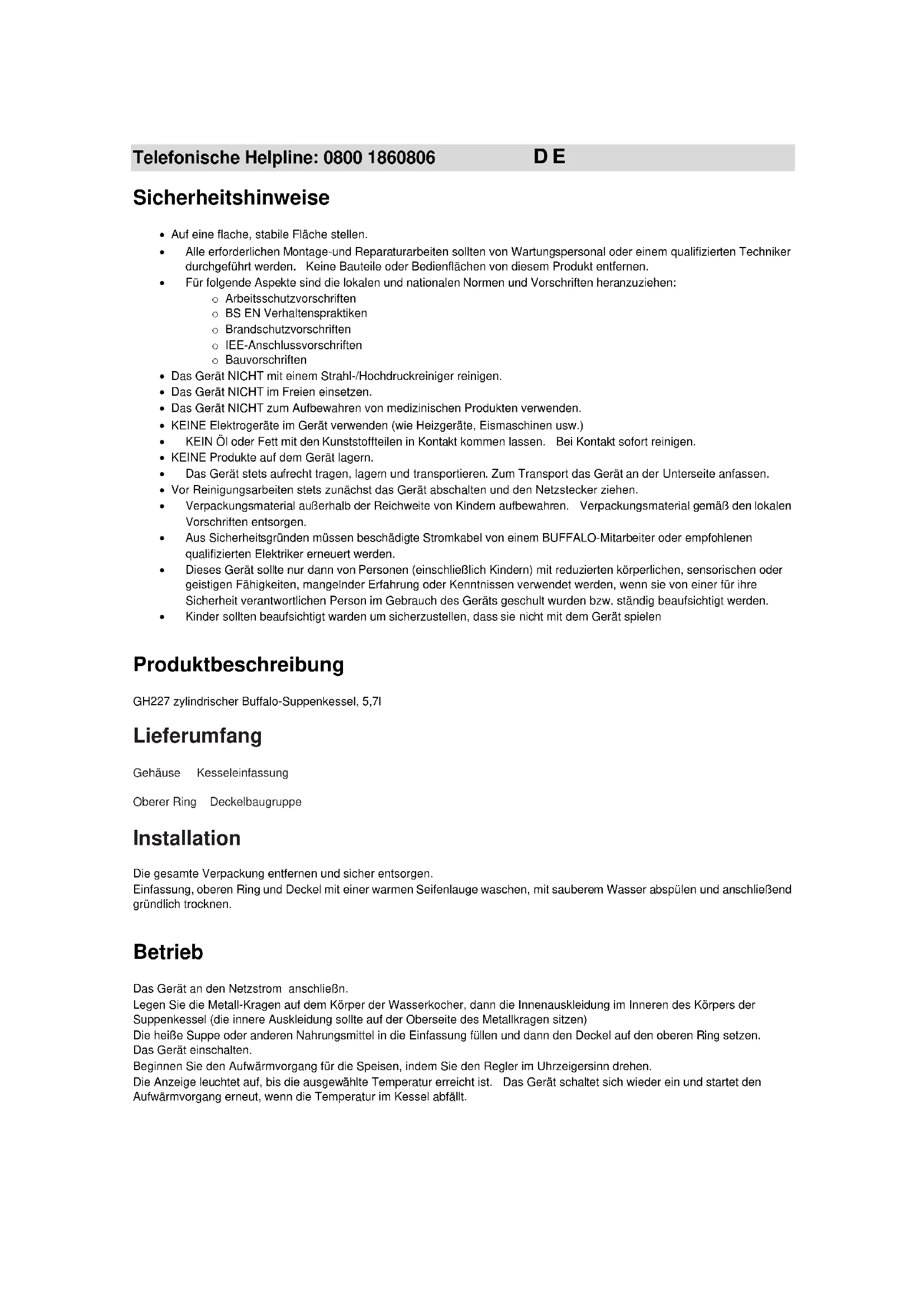 Tous droits réservés. La production ou transmission, partielle ou intégrale, sous quelque forme que ce soit ou par n’importe quel moyen, tant électronique, mécanique, sous forme de photocopie, d’enregistrement ou autre de ce mode d’emploi sont interdites sans autorisation préalablement accordée par BUFFALO.Nous nous efforçons, par tous les moyens dont nous disposons, de faire en sorte que les détails contenus dans le présent mode d’emploi soient corrects en date d’impression.Toutefois, BUFFALO se réserve le droit de changer les spécifications de ses produits sans préavis.Telefonische Helpline: 0800 1860806 DE Sicherheitshinweise Auf eine flache, stabile Fläche stellen. Alle erforderlichen Montage-und Reparaturarbeiten sollten von Wartungspersonal oder einem qualifizierten Techniker durchgeführt werden. Keine Bauteile oder Bedienflächen von diesem Produkt entfernen. Für folgende Aspekte sind die lokalen und nationalen Normen und Vorschriften heranzuziehen: o Arbeitsschutzvorschriften o BS EN Verhaltenspraktiken o Brandschutzvorschriften o IEE-Anschlussvorschriften o Bauvorschriften Das Gerät NICHT mit einem Strahl-/Hochdruckreiniger reinigen. Das Gerät NICHT im Freien einsetzen. Das Gerät NICHT zum Aufbewahren von medizinischen Produkten verwenden. KEINE Elektrogeräte im Gerät verwenden (wie Heizgeräte, Eismaschinen usw.) KEIN Öl oder Fett mit den Kunststoffteilen in Kontakt kommen lassen. Bei Kontakt sofort reinigen. KEINE Produkte auf dem Gerät lagern. Das Gerät stets aufrecht tragen, lagern und transportieren. Zum Transport das Gerät an der Unterseite anfassen. Vor Reinigungsarbeiten stets zunächst das Gerät abschalten und den Netzstecker ziehen. Verpackungsmaterial außerhalb der Reichweite von Kindern aufbewahren. Verpackungsmaterial gemäß den lokalen Vorschriften entsorgen. Aus Sicherheitsgründen müssen beschädigte Stromkabel von einem BUFFALO-Mitarbeiter oder empfohlenen qualifizierten Elektriker erneuert werden. Dieses Gerät sollte nur dann von Personen (einschließlich Kindern) mit reduzierten körperlichen, sensorischen oder geistigen Fähigkeiten, mangelnder Erfahrung oder Kenntnissen verwendet werden, wenn sie von einer für ihre Sicherheit verantwortlichen Person im Gebrauch des Geräts geschult wurden bzw. ständig beaufsichtigt werden. Kinder sollten beaufsichtigt warden um sicherzustellen, dass sie nicht mit dem Gerät spielen Produktbeschreibung GH227 zylindrischer Buffalo-Suppenkessel, 5,7l Lieferumfang Gehäuse Kesseleinfassung Oberer Ring Deckelbaugruppe Installation Die gesamte Verpackung entfernen und sicher entsorgen. Einfassung, oberen Ring und Deckel mit einer warmen Seifenlauge waschen, mit sauberem Wasser abspülen und anschließend gründlich trocknen. Betrieb Das Gerät an den Netzstrom anschließn. Legen Sie die Metall-Kragen auf dem Körper der Wasserkocher, dann die Innenauskleidung im Inneren des Körpers der Suppenkessel (die innere Auskleidung sollte auf der Oberseite des Metallkragen sitzen) Die heiße Suppe oder anderen Nahrungsmittel in die Einfassung füllen und dann den Deckel auf den oberen Ring setzen. Das Gerät einschalten. Beginnen Sie den Aufwärmvorgang für die Speisen, indem Sie den Regler im Uhrzeigersinn drehen. Die Anzeige leuchtet auf, bis die ausgewählte Temperatur erreicht ist. Das Gerät schaltet sich wieder ein und startet den Aufwärmvorgang erneut, wenn die Temperatur im Kessel abfällt.DE Reinigung, Pflege und Wartung Von der Stromversorgung trennen und abkühlen lassen. Erst dann das Wasser aus dem Gehäuse auskippen. Beim erneuten Gebrauch des Kessels stets frisches Wasser verwenden. Einfassung, oberen Ring und Deckel nach jedem Gebrauch waschen. Das Äußere und Innere des Geräts abwischen, um Lebensmittelreste zu entfernen. Das Gehäuse aber nicht in Wasser eintauchen oder mit einem Hochdruckreiniger reinigen. Störungssuche Technische Spezifikationen Code Spannung Leistung Watt Stromstärke Ampere Abmessungen