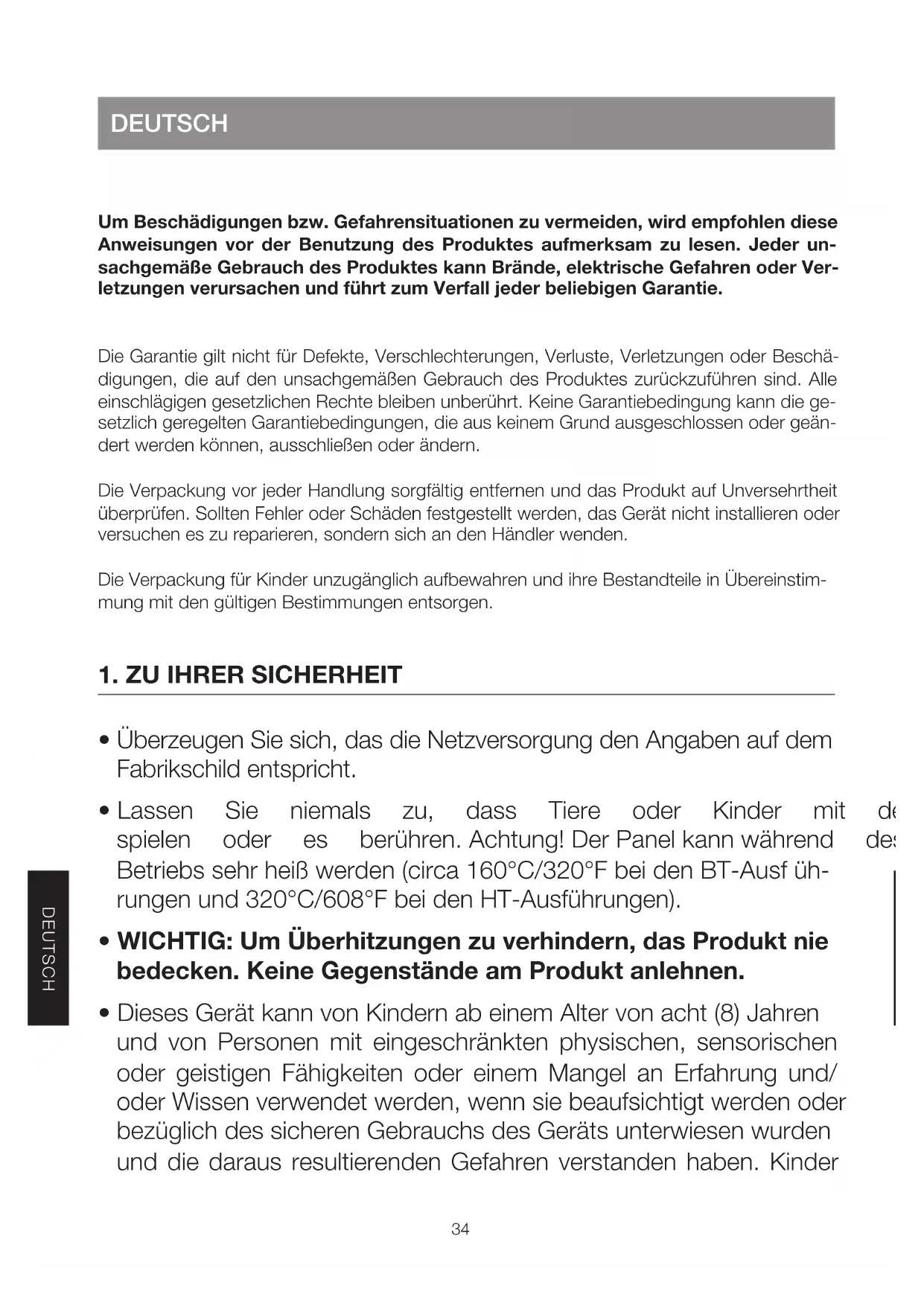 - WICHTIG: Um Überhitzungen zu verhindern, das Produkt nie bedecken. Keine Gegenstände am Produkt anlehnen.